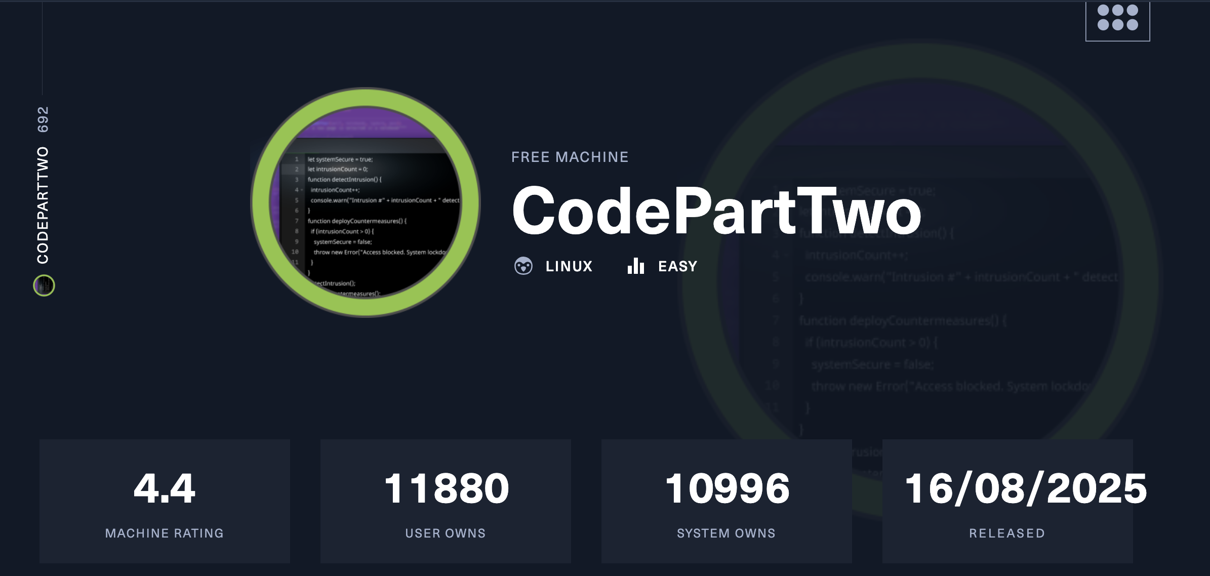 31 Jan, 2026 Hack The Box: CodePartTwo Machine Walkthrough – Easy Diffculty Easy Machine Challenges, CVE-2024-28397, HackTheBox, js2py, Linux, npbackup-cli, python3, Sandbox bypass, sqlite3, ssh, ssti
