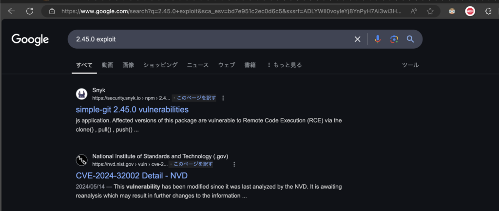 A search through an online vulnerability database reveals that this version contains a critical vulnerability, CVE-2024-32002.