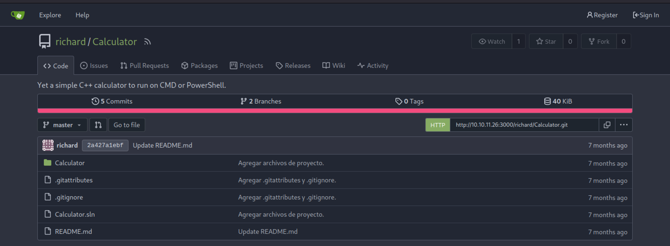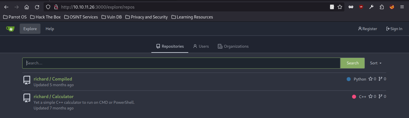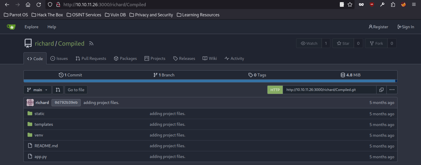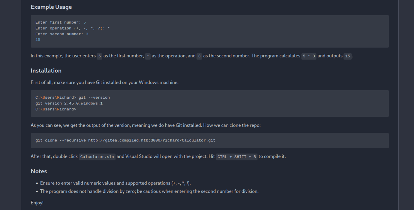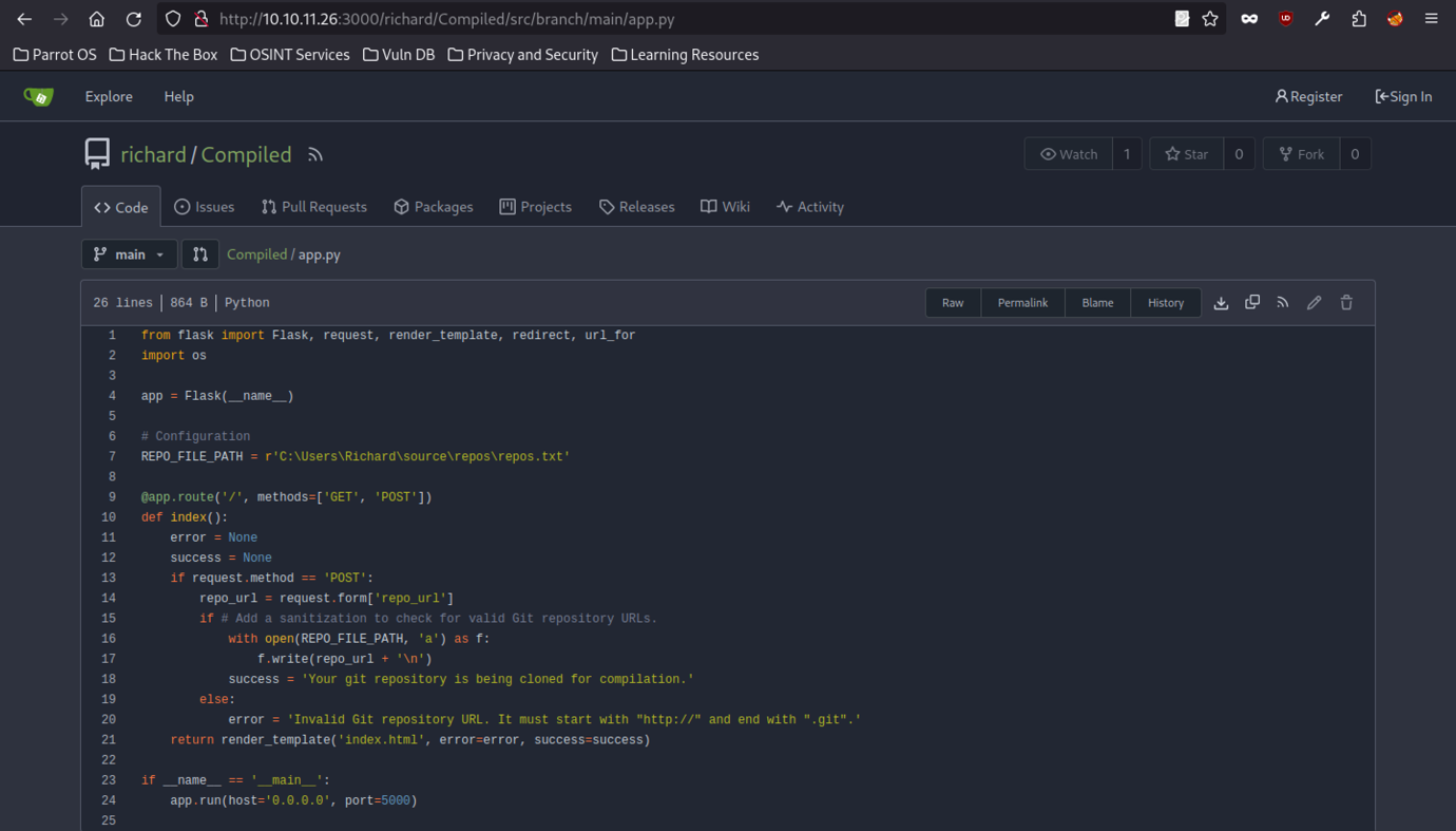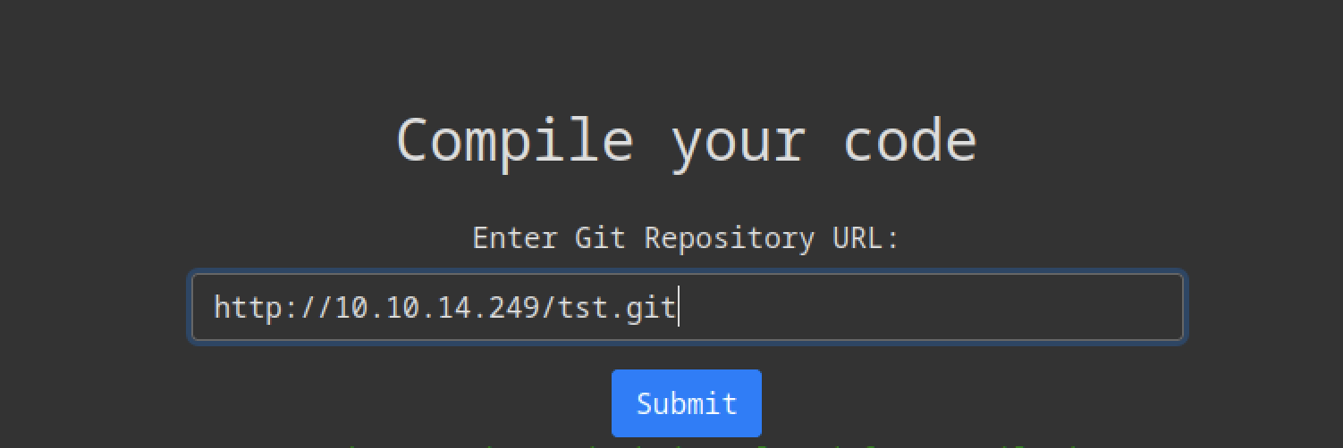 The “Compiled” project, hosted on the Gitea repository at http://10.10.11.26:5000, allows users to input a URL to compile C++, C#, and .NET projects online. This functionality resembles an older HTB machine that was affected by the same RCE vulnerability. The reconnaissance details suggest that we can provide a Git URL (starting with “http://” and ending with “.git”) to http://ip:5000, which will then execute Git locally on the target Windows machine. This process retrieves resources, including potentially sensitive information, as indicated in the code explanation.