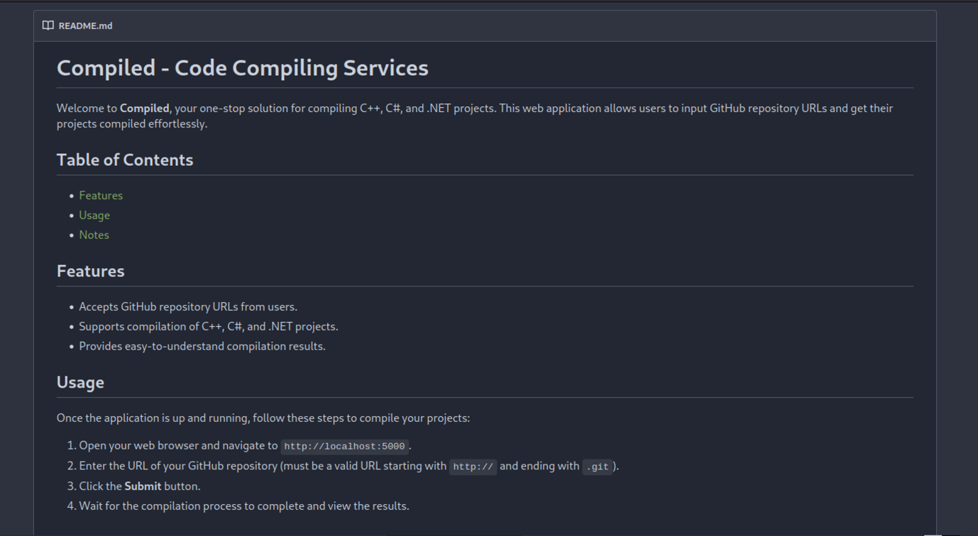 The “Compiled” project offers an integrated solution for compiling C++, C#, and .NET projects. Users can input GitHub repository URLs, facilitating effortless project compilation through http://localhost:5000 when hosted locally.