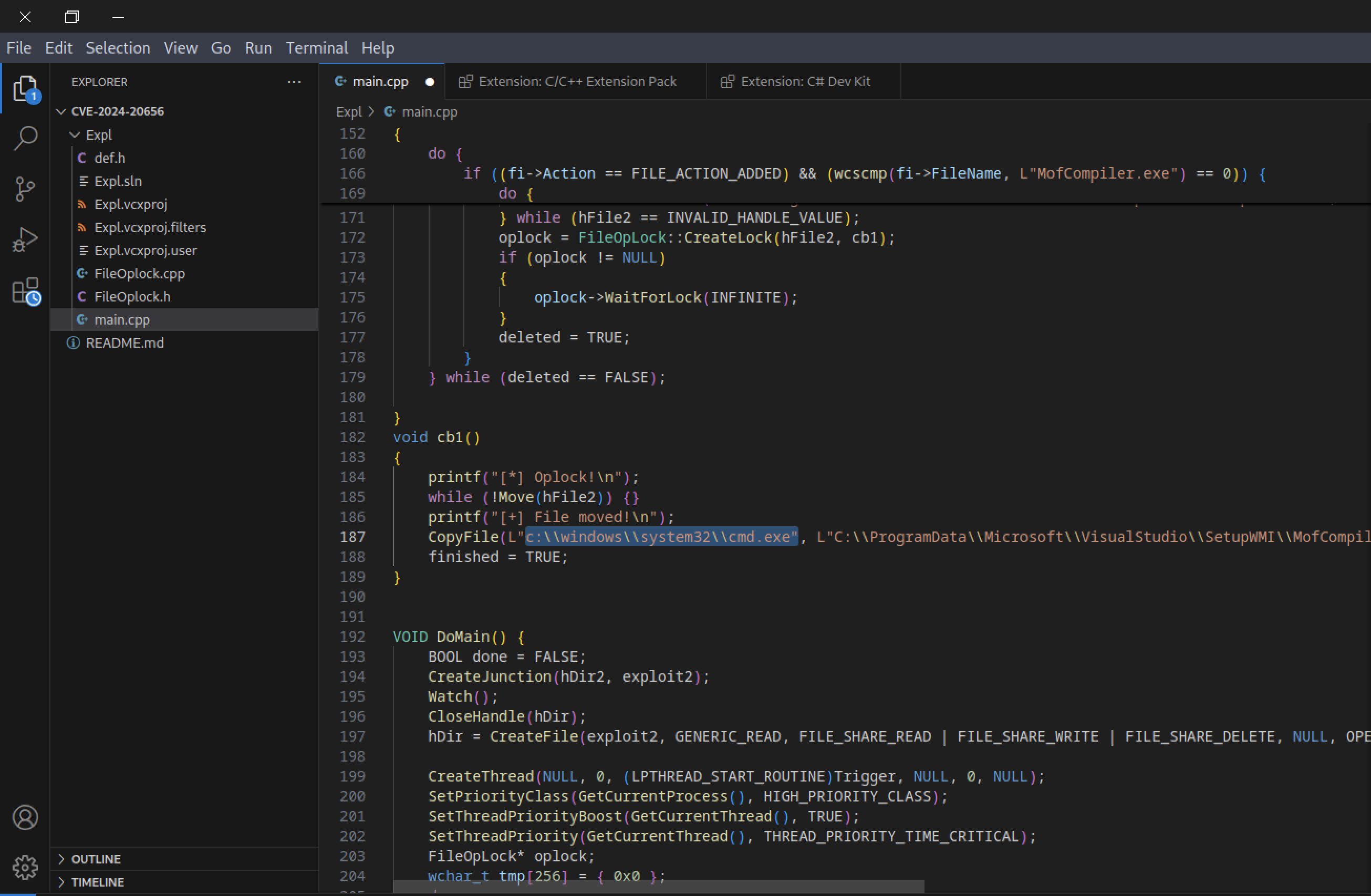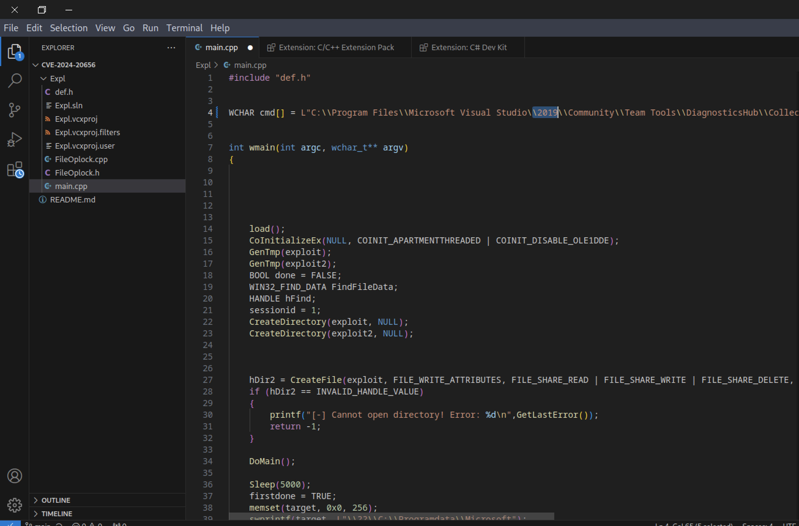 7. Action on Objectives: To implement the exploit, after opening Expl.sln in Visual Studio, the attacker modifies the POC by adjusting the cmd variable in main.cpp to the path of VSDiagnostics.exe, as the POC is configured for Visual Studio 2022, while the target system runs Visual Studio 2019.