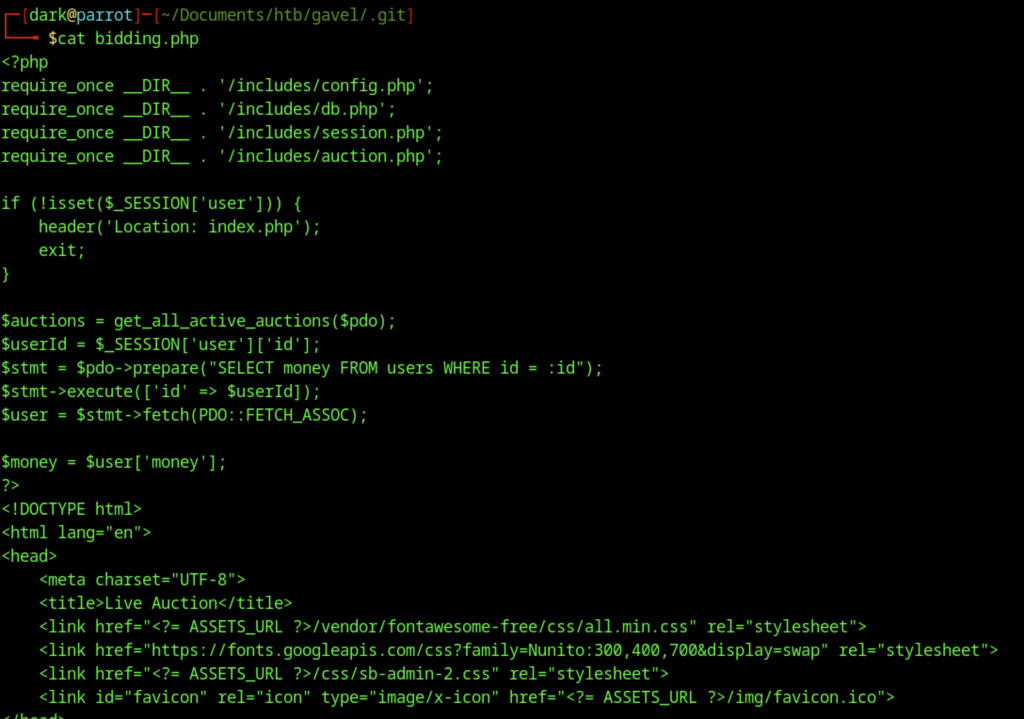 Attackers obtained the user flag through source code leakage and credential reuse. An exposed .git directory leaked the full repository. The repository contained bcrypt password hashes. John the Ripper cracked the hash for user auctioneereer with the rockyou.txt wordlist. This revealed the password midnight1. Attackers gained a www-data reverse shell by injecting commands into the admin panel’s rule field. They reused the same credentials with su auctioneereer to switch users. Reading /home/auctioneereer/user.txt gave the flag