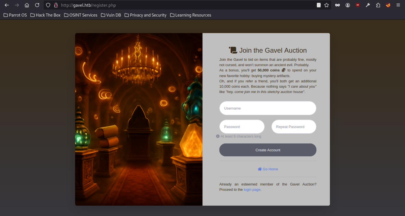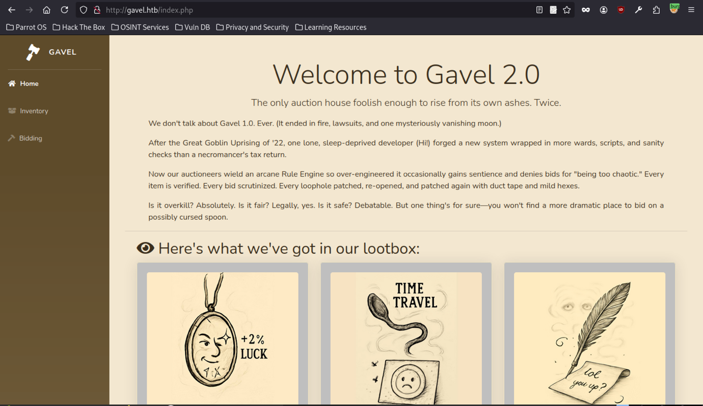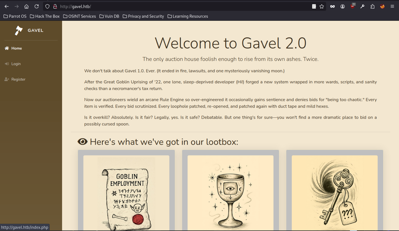 The main page at http://gavel.htb/index.php shows the “Welcome to Gavel 2.0” theme. It includes backstory about the auction house. There are clear login and register links.