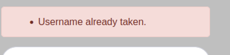 Trying to register an existing username shows the error “Username already taken.” This appears directly on the registration page.
