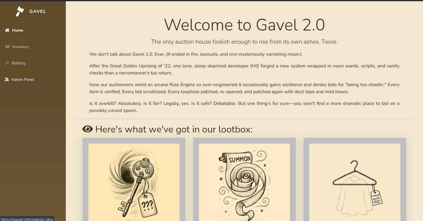 Visiting http://gavel.htb/admin.php as the authenticated user loads the main index.php content. The page shows the “Welcome to Gavel 2.0” lore and lootbox section. No actual admin panel interface appears.