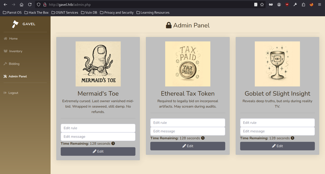 Re-loading http://gavel.htb/admin.php shows updated timers. Ethereal Tax Token now has 128 seconds remaining.
