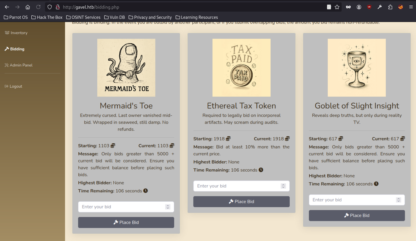The page at http://gavel.htb/bidding.php shows three active auction items.
