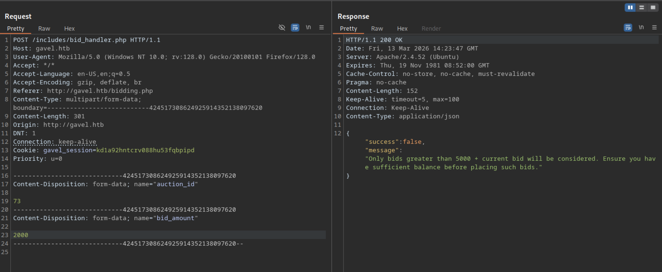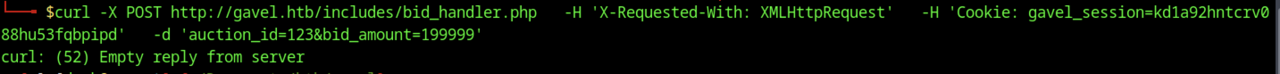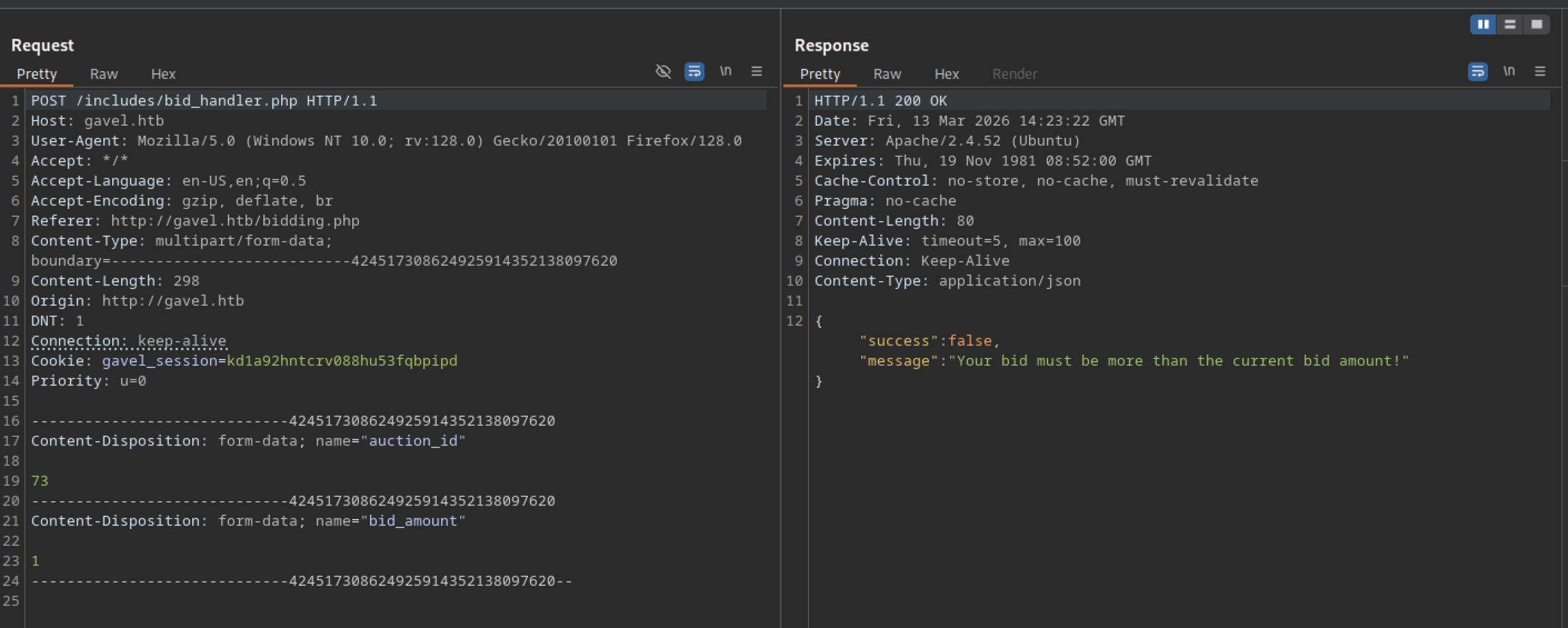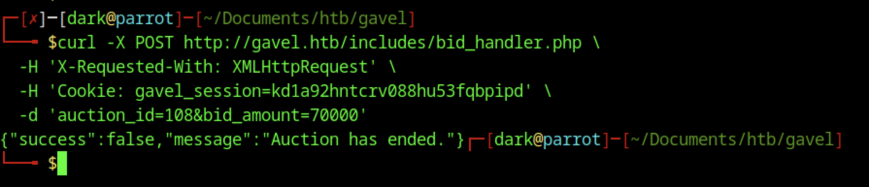 A POST request to /includes/bid_handler.php included the X-Requested-With: XMLHttpRequest header and a valid gavel_session cookie. The payload attempted to place a 70,000-coin bid on auction ID 1088, and the server returned {"success":false,"message":"Auction has ended."}.