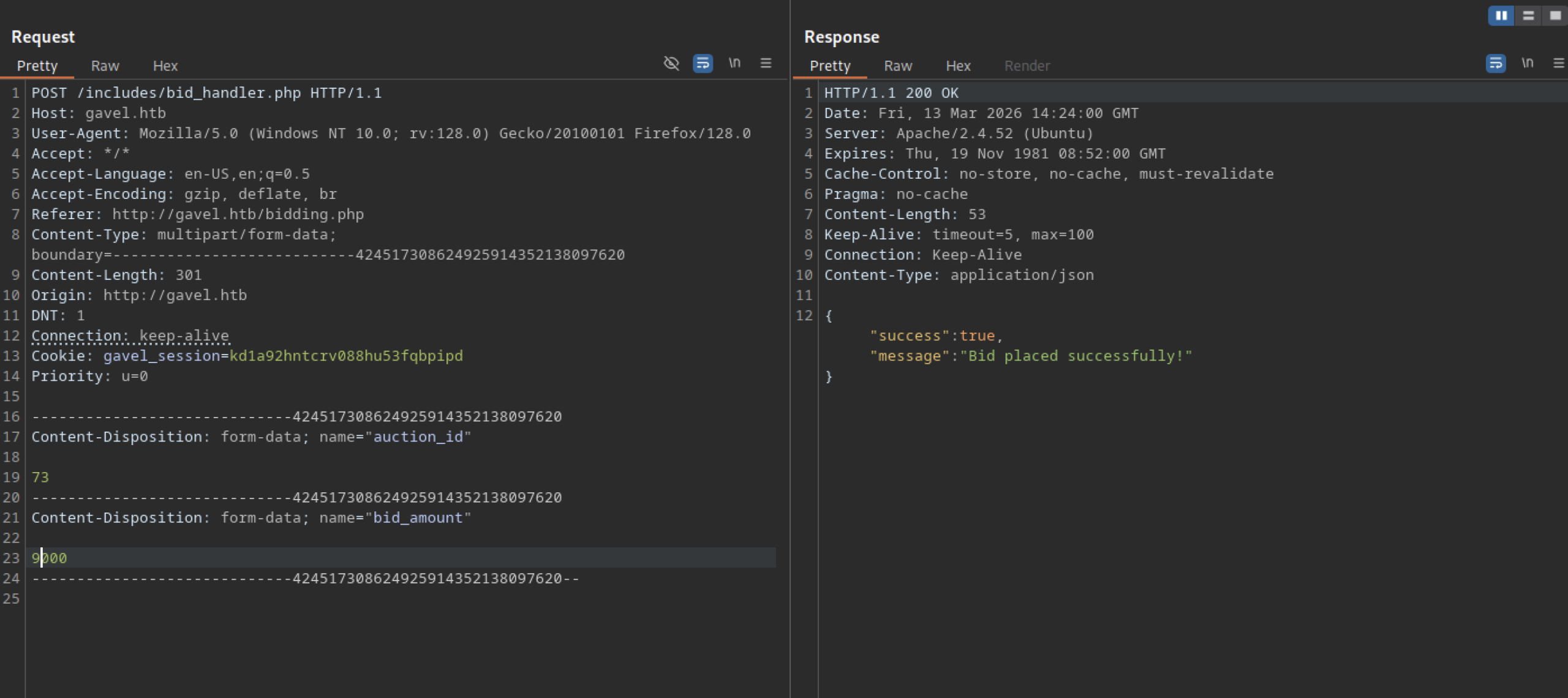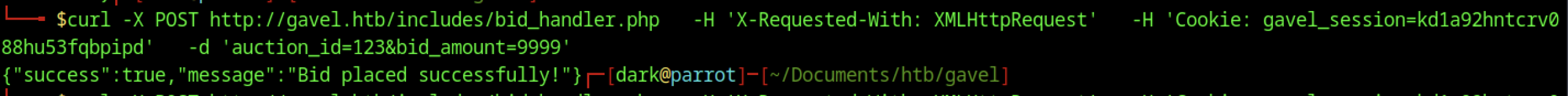 Sending a POST request to /includes/bid_handler.php with the X-Requested-With: XMLHttpRequest header and a valid gavel_session cookie placed a bid of 9999 coins on auction ID 123. The server returned the JSON response {"success":true,"message":"Bid placed successfully!"}.