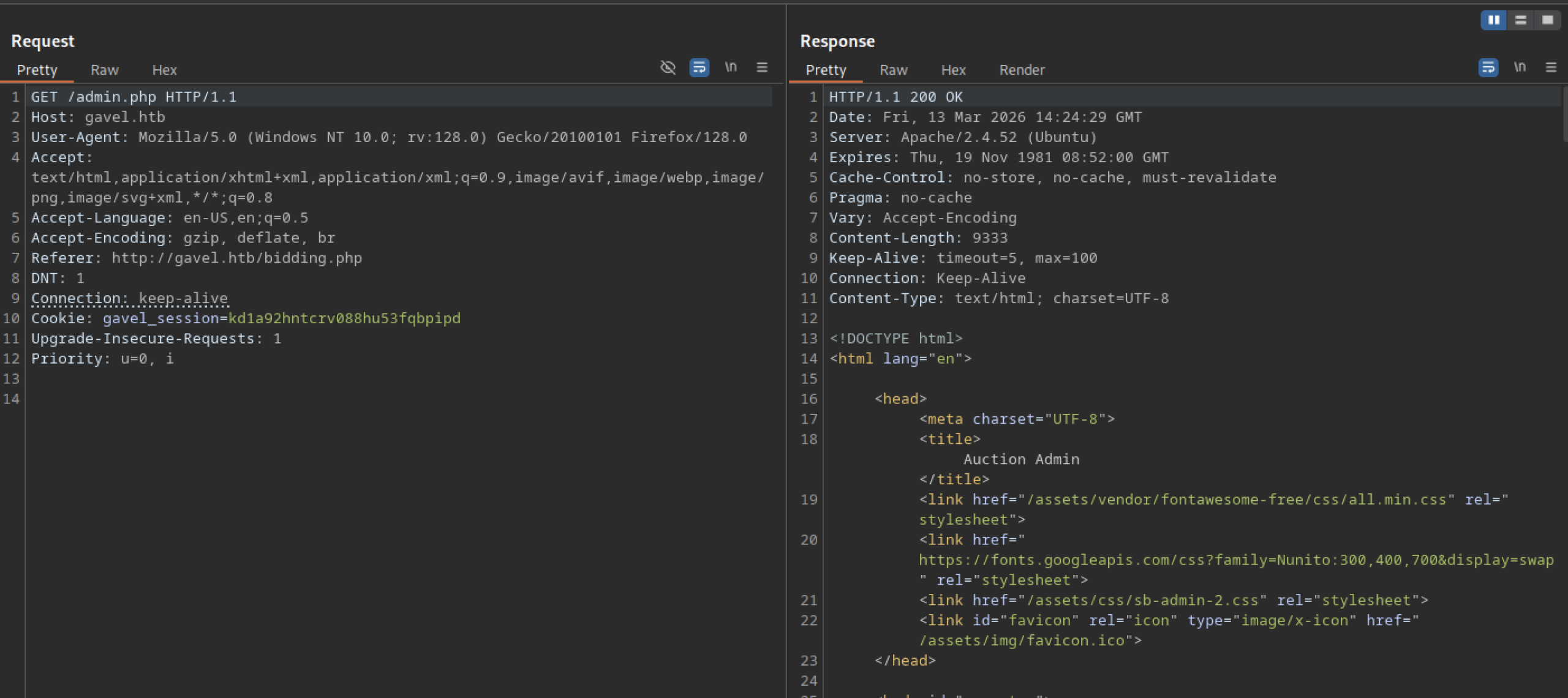 Accessing http://gavel.htb/admin.php as the authenticated low-privilege user auctioneereer returns a 200 OK response. The page loads the full “Auction Admin” interface.