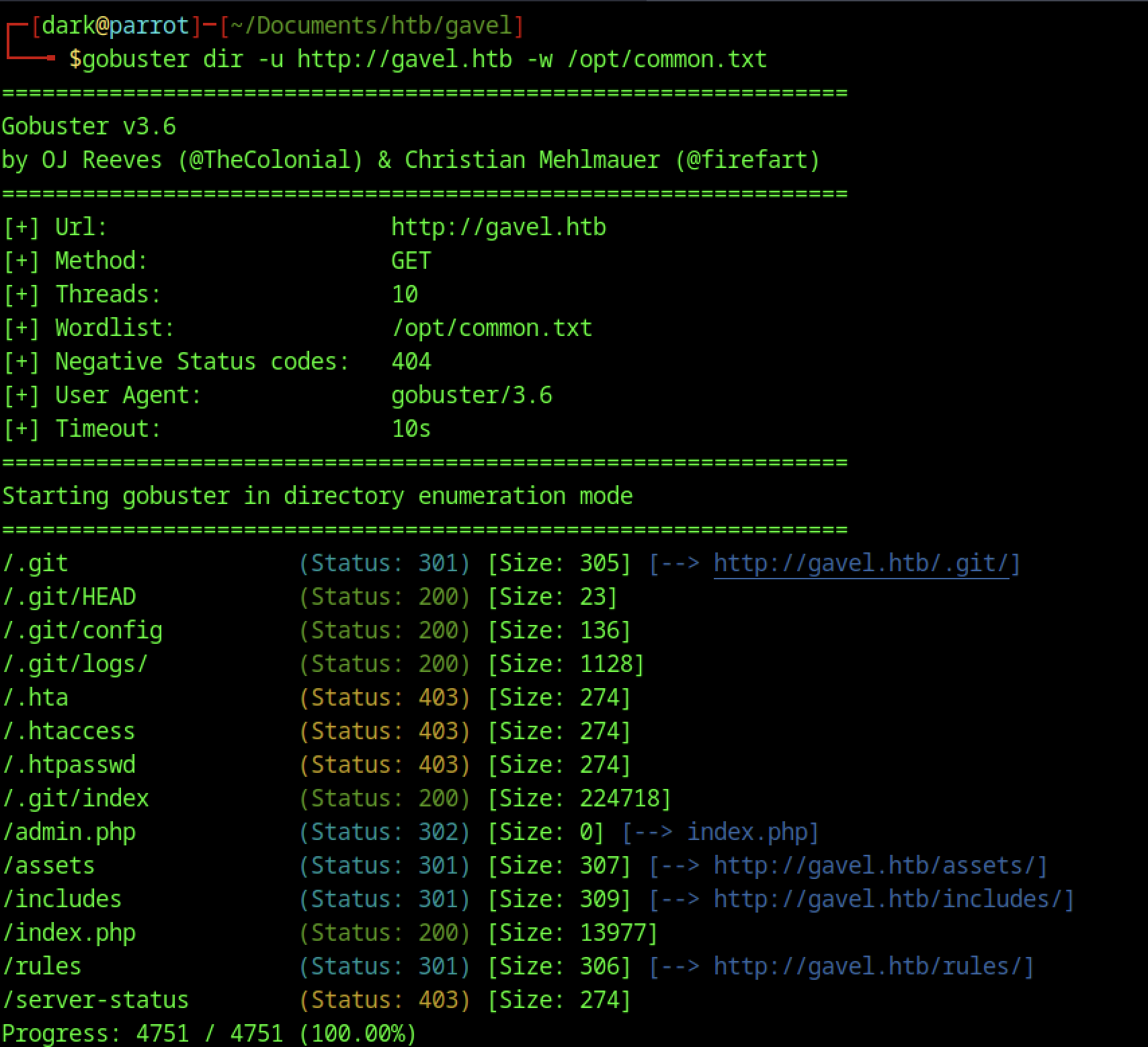 Running Gobuster against http://gavel.htb with the common.txt wordlist quickly identified an exposed /.git directory returning a 301 redirect.