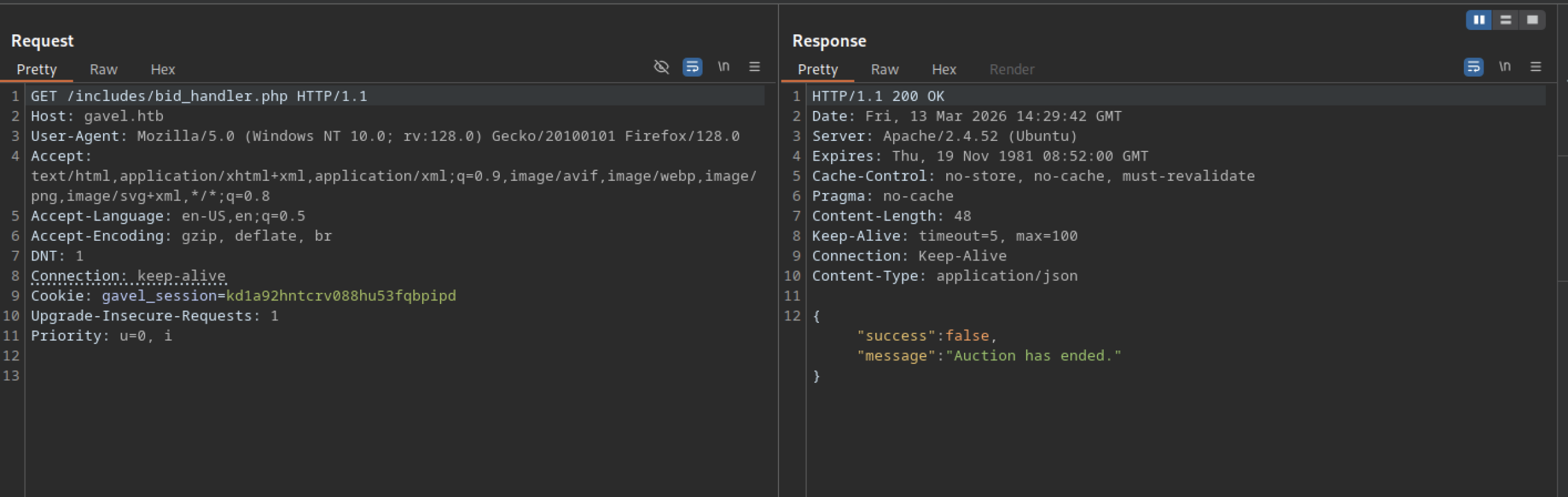 A GET request to http://gavel.htb/includes/bid_handler.php with no parameters returns 200 OK. The response body is JSON: {“success”:false,”message”:”Auction has ended.”}