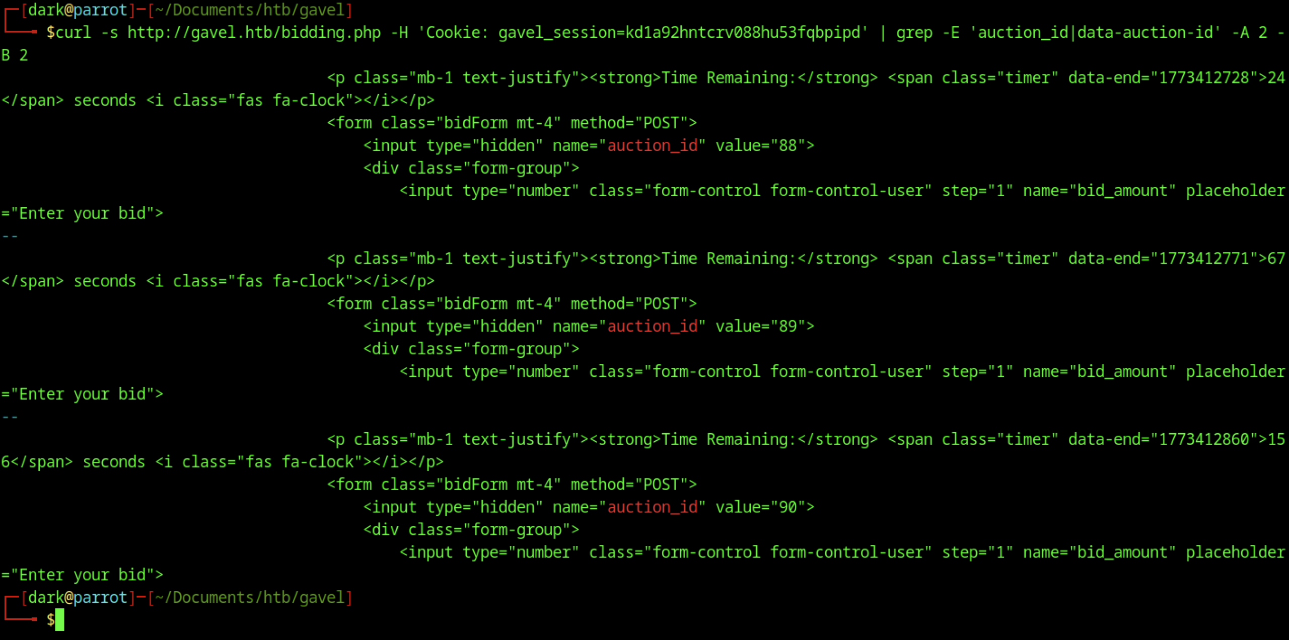 Curl command pipes the /bidding.php page content through grep. It extracts hidden input fields named auction_id with values 88, 89, and 90. The grep also pulls nearby elements with data-end timestamps.