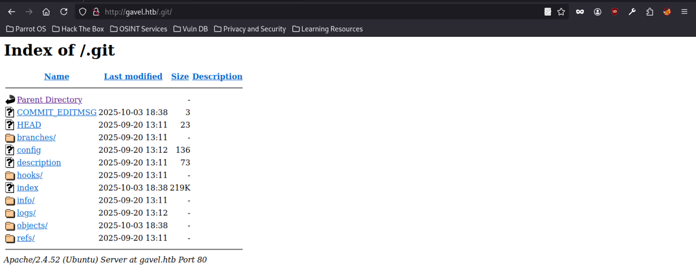 Accessing http://gavel.htb/.git/ in the browser displays a full directory listing. Readable .git objects, HEAD, config, index, refs, logs, and hooks folders are all visible.