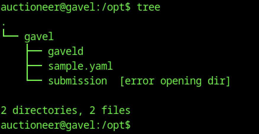 Running tree in /opt shows the gavel directory containing gaveld binary, gaveld (likely a symlink or duplicate), sample.yaml, and a submission directory (access denied), indicating the main auction daemon and configuration files reside in /opt/gavel with restricted submission area.