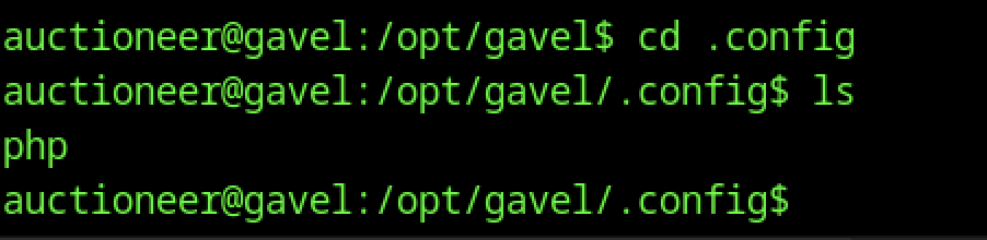 Changing to /opt/gavel/.config and listing contents reveals a php subdirectory, suggesting PHP-specific configuration files are stored in a hidden .config folder under the application directory which is a non-standard location that may hold custom php.ini overrides.