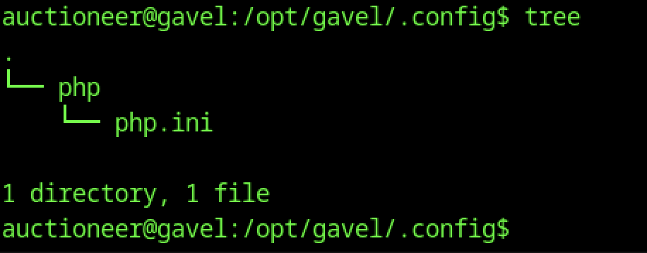 Running tree inside /opt/gavel/.config reveals only the php/php.ini file, indicating the presence of a custom PHP configuration override stored outside the standard /etc/php directories. This file is likely loaded by the gaveld service or Apache to enforce specific runtime restrictions for auction-related processing.