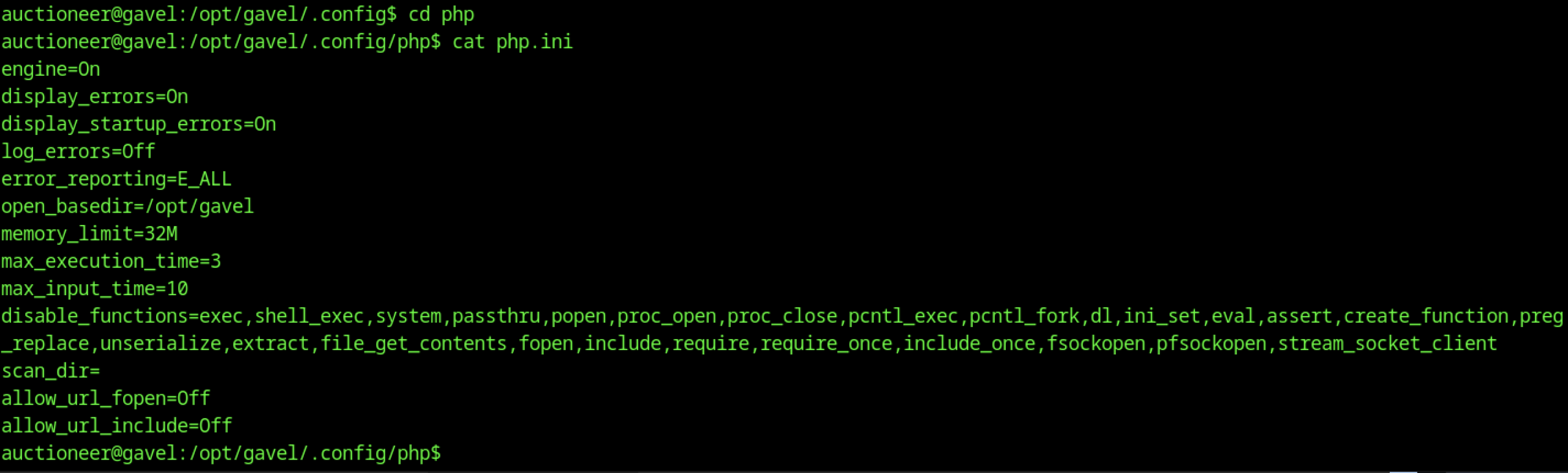 Viewing php.ini in /opt/gavel/.config/php reveals a heavily restricted custom configuration. The file disables dangerous PHP functions such as exec, system, and shell_exec enforces open_basedir=/opt/gavel, applies low execution timeouts, and disables allow_url_fopen and allow_url_include. These settings indicate a hardened PHP execution environment, though the presence of this custom configuration suggests it may be loaded by the gaveld service or a related subprocess.