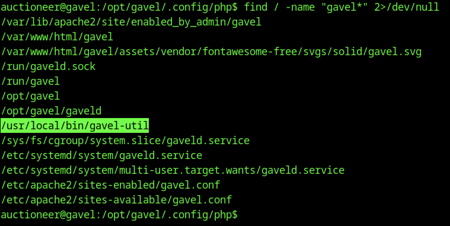 Executing find / -name "gavel*" identifies multiple gavel-related paths, including /usr/local/bin/gavel-util, /opt/gavel/gaveld, systemd service files (gaveld.service), Apache configuration files, sockets (/run/gaveld.sock), and the web root. This enumeration maps the application’s footprint on the system and highlights /usr/local/bin/gavel-util