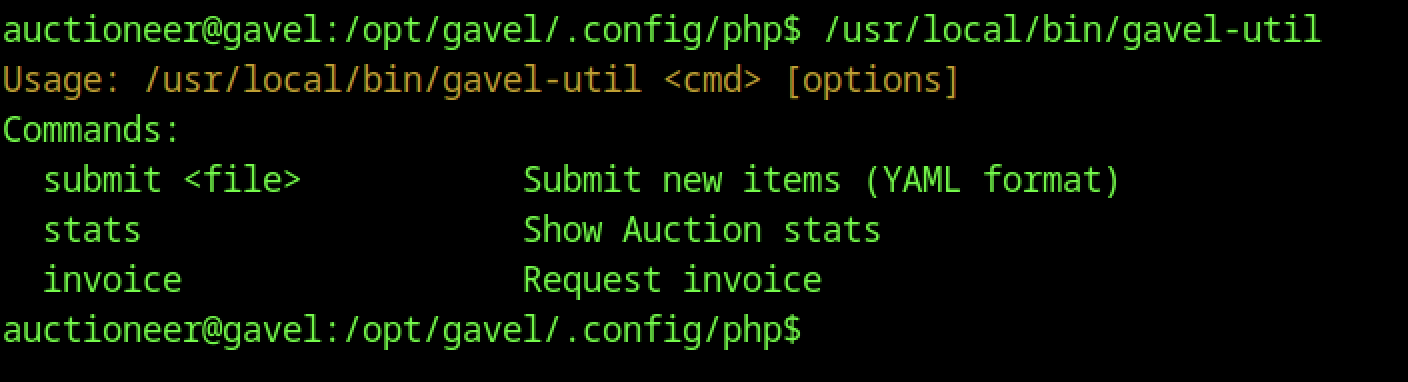 Running /usr/local/bin/gavel-util without arguments displays usage and available commands (submit, stats, invoice), confirming this is a privileged CLI tool for auction management — likely executed by gaveld or cron, making it a prime target for analyzing command execution flow or argument injection.