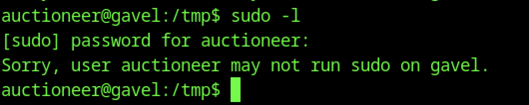 sudo -l as auctioneereer prompts for password and returns “Sorry, user auctioneereer may not run sudo on gavel”, indicating no sudo privileges are available to this user — privilege escalation must rely on other vectors (SUID, cron, writable files, or service misconfigs).