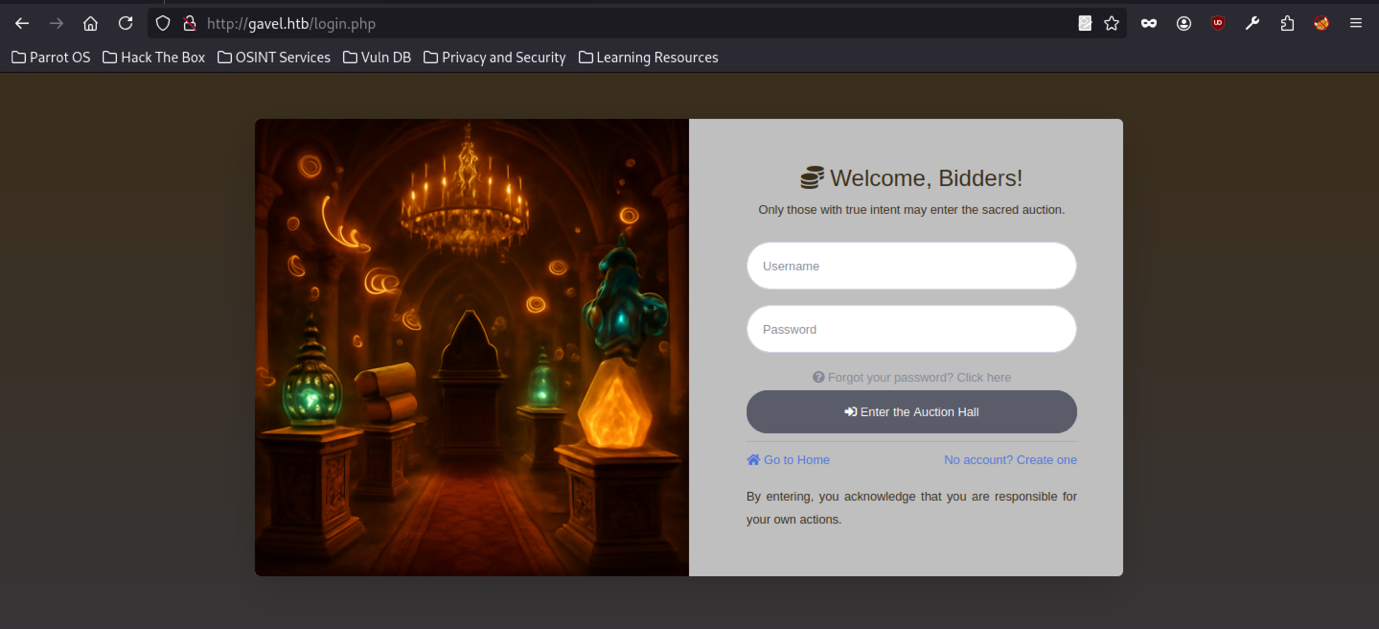 The login page at http://gavel.htb/login.php presents a clean authentication form with username and password fields.