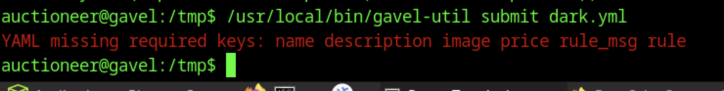 Executing /usr/local/bin/gavel-util submit dark.yaml fails with “YAML missing required keys: name description image price rule_msg rule”, showing the utility strictly validates submission YAML structure before processing new auction items, preventing incomplete or malicious submissions without all mandatory fields.