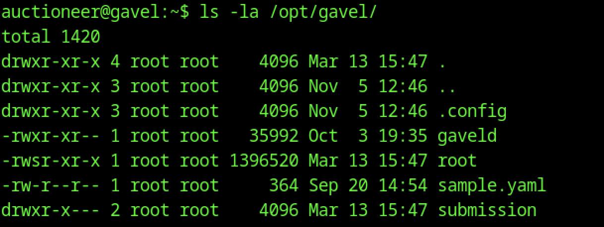 ls -la in /opt/gavel reveals ownership by root:root for most files (including gaveld binary with 755 perms, sample.yaml, and .config dir), but the submission directory has restricted perms (drwxr-x—), suggesting auction submissions are processed with elevated privileges inside a restricted area.