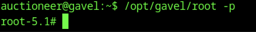 Executing /opt/gavel/root -p as auctioneereer immediately spawns a root shell (root-5.1#), confirming the SUID binary /opt/gavel/root (created via earlier YAML submission exploit) grants unrestricted root access when run with preserved effective UID.