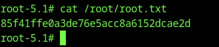Reading /root/root.txt inside the root shell yields the final flag 85f41fffe0a3de765e5accc8a6152dcae2d, proving complete machine compromise from initial web foothold through credential reuse, rule evaluation RCE, SUID bash copy, and privilege escalation to root.