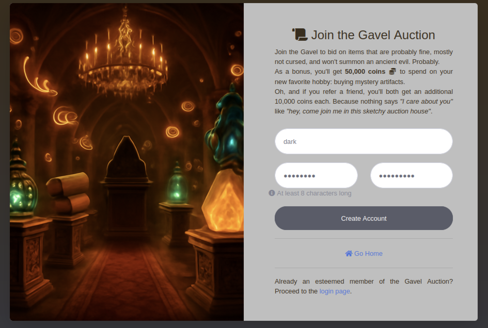 The registration page at http://gavel.htb/register.php contains a simple form with username, password, and password confirmation fields. Submitting valid credentials (e.g., username “dark”, password “admin123”) via POST to /register.php creates the account on the server.
