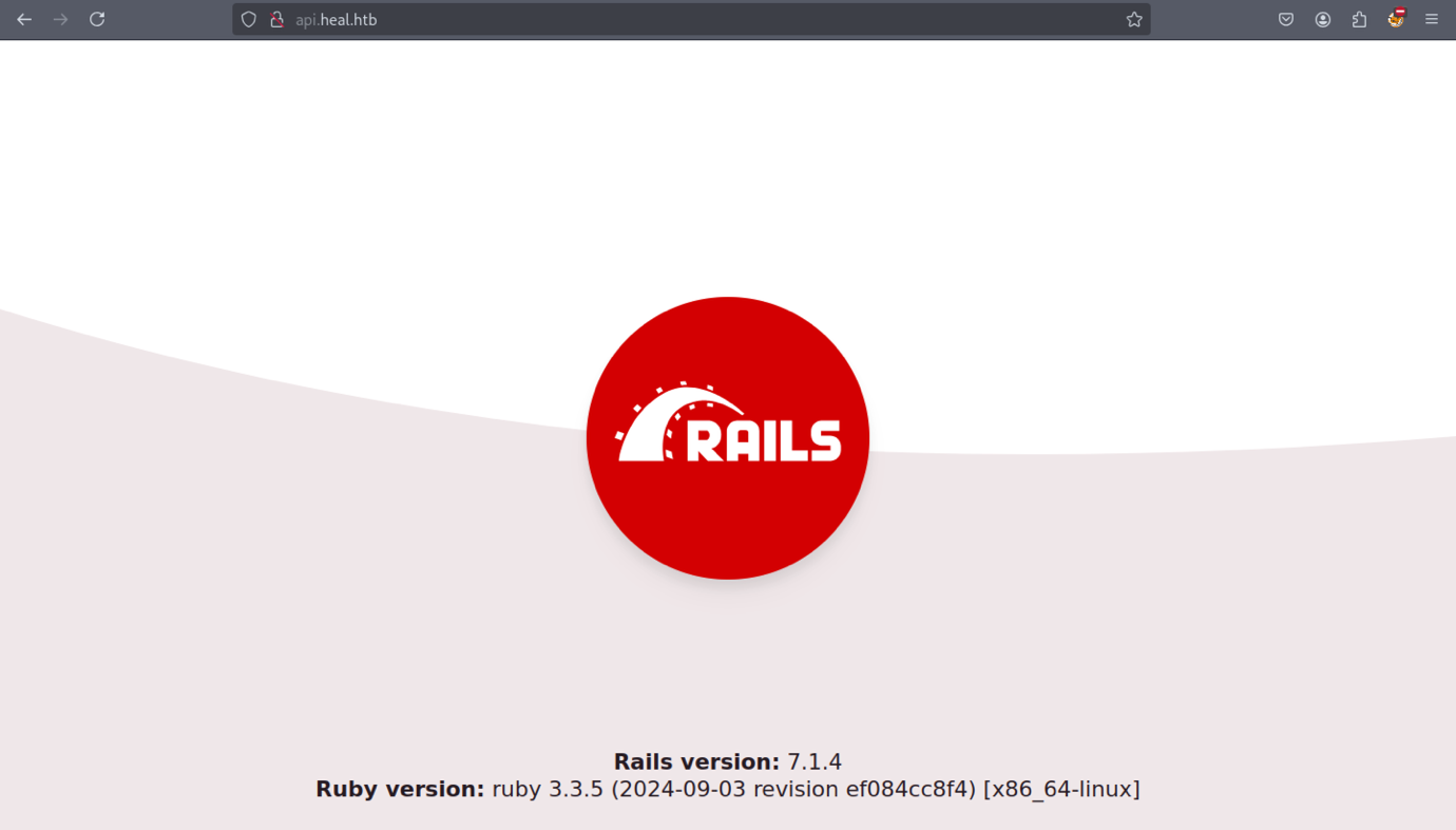 The api.heal.htb subdomain displays a Ruby on Rails web interface.