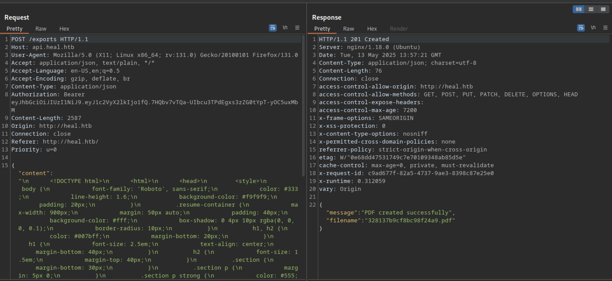 There’s an ‘Export as PDF‘ button that we can further investigate using Burp Suite.