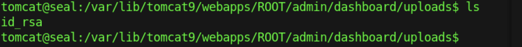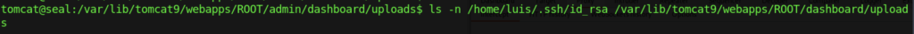 Without further ado, We should be able to retrieve luis by executing the command “ls -n /home/luis/.ssh/id_rsa /var/lib/tomat9/webapps/ROOT/admin/dashboard/uploads“