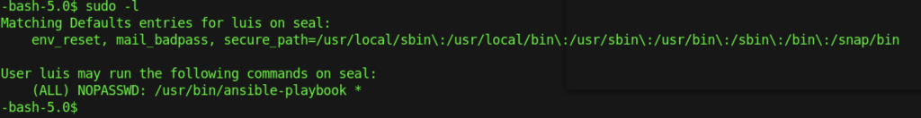 By running sudo -l command, we will manage to get SUID access to the machine. We can abuse the ansible-playbook assigned to root